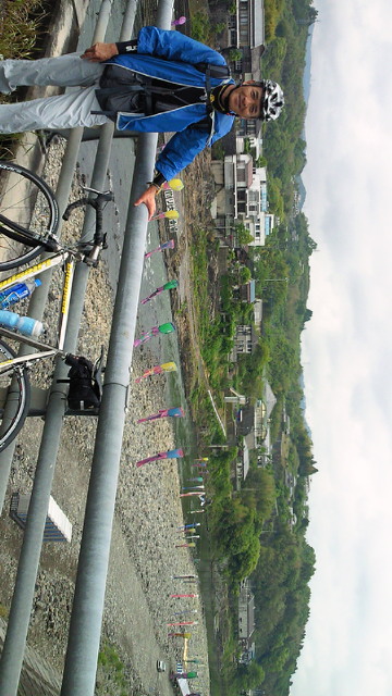 早くも危機。レースの疲れと、相変わらずの足の状態と雨で士気低下。7時半、やっと意を決してスタート。 濡れた路面にタイヤが滑り、思い出したのがチェリッシュの曲、転倒無視のサンバ(笑)。湾越しに振り返った別府は雲に覆われていました(写真)。大分を過ぎる頃には、雨は上がったものの、326号線を選んだのが泣きっ面に蜂。特に三重町からトトロの森の生目町。延々と続く上りに悪戦苦闘。そんな中で、犬飼町の川の上に泳ぐ鯉のぼり(写真)と、トトロの森のそばにある北川ダム、唄げんか大橋(写真)、そして広葉樹の新緑の美しさが、心を癒してくれました。 今は延岡のすぐ手前。一泊2500円の宿にいます。走行距離125キロ。