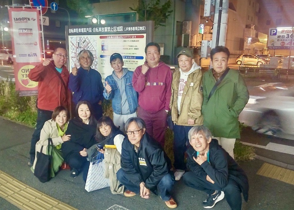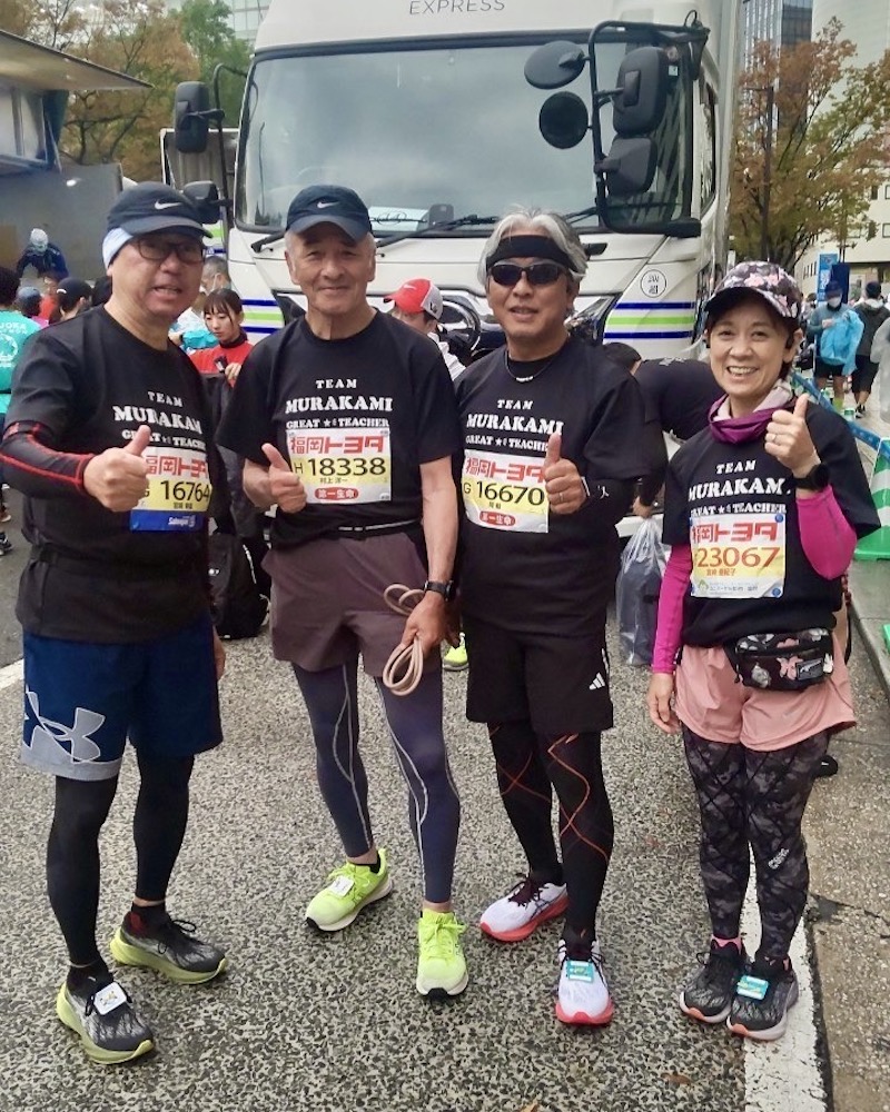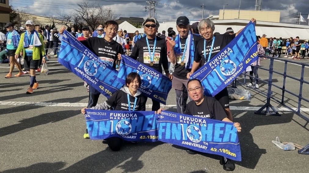 『7時だよ、全員集合!』 ところが遅刻者一名。 迷惑なんだよな〜、こんな奴が・・。 遅刻者到着してG・Hブロック組の揃い踏み! 『18338番、反省の表情になってないよ!』 スタート前雨が落ちてきた。ちと寒うござった・・。 号砲響いて10分後、やっと高島市長応援するスタート地点到着。 スタート後は取り残され孤独な一人旅『母をたずねて42.195km』 去年のリタイア地点過ぎても歩かず、走りに走った涙、涙の物語。 『君が行く道の長手を繰り畳ね焼き滅ぼさむ天の火もがも』 30km地点前後、歩きが増えたがドンマイドンマイ、実力相応! そしてリベンジ成って感動のゴ、ゴ〜〜〜ル! ここも一人大きく遅刻したが、完走すれば問題ナッシング。 メンバー全員完走メダル掴み取って集合写真。 今回の記録:グロス 5時間49分02秒 ネット 5時間38分10秒 場面は一気に飛んで、博多駅近くの飲み屋の慰労会。 完走者のドヤ顔記念写真。 沿道や応援ナビで声援くれた仲間も揃って12人の大宴会! しか〜し、この最後の最後で歳の差が出た。 脚は絶えず痛みに襲われ、疲労が目蓋を閉ざそうとかかる。 遂にギブアップ宣言! 1〜2時間で中座・帰宅となった・・。 若いって素晴らしい〜! 二次会熱唱で一段と盛り上がったらしい。 同走の皆さん、応援の皆さん、今日は一日本当にありがとう。 来年はランも飲み会も全力投球します。(笑) 今後もヨ・ロ・シ・ク、宜しく〜! 以下は、来年度に向けての方針・抱負。 ① 短・中・長期目標を設定、達成感・自己満足を味わう。 ② 練習成果の見える化を図る。(月例練習メニュー設定) ③ スピード練・長距離練の計画的実施。 ④ 福岡・東京マラソンの他、10km・ハーフのレース出走。 ⑤ 福岡マラソン2024、5時間内完走! 有言不実行が我が得意技、法螺はこれくらいにしておく。 それに⑤は取り消し! お忘れください。⑤は無しよ〜!(笑)