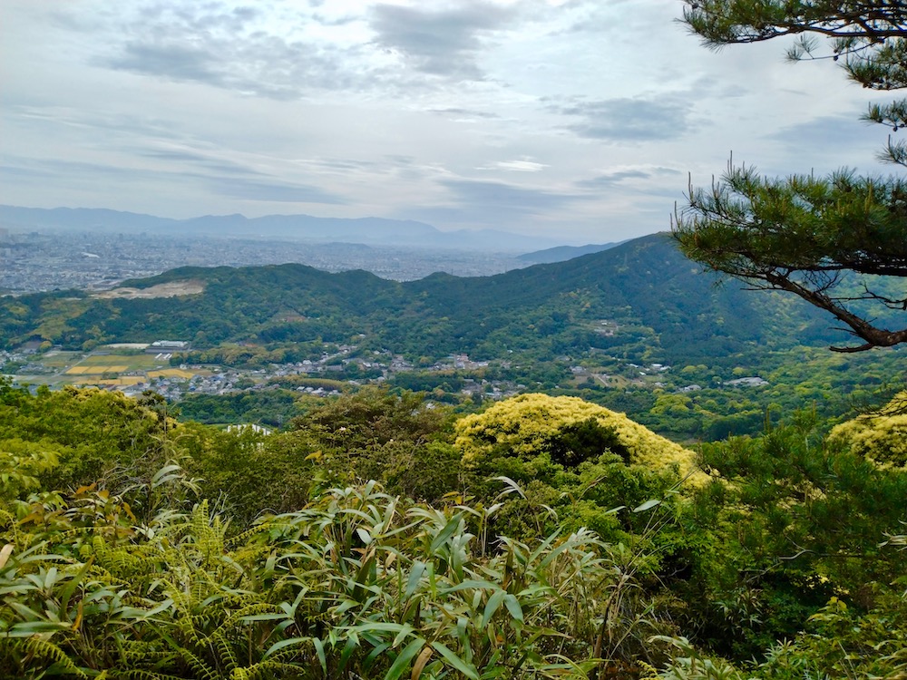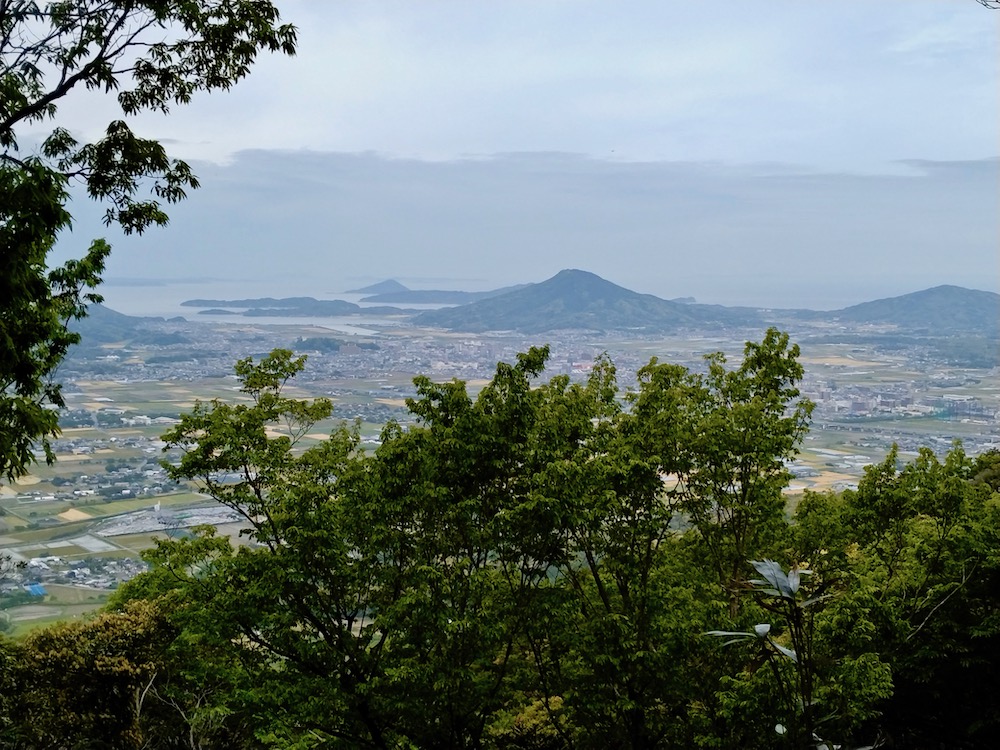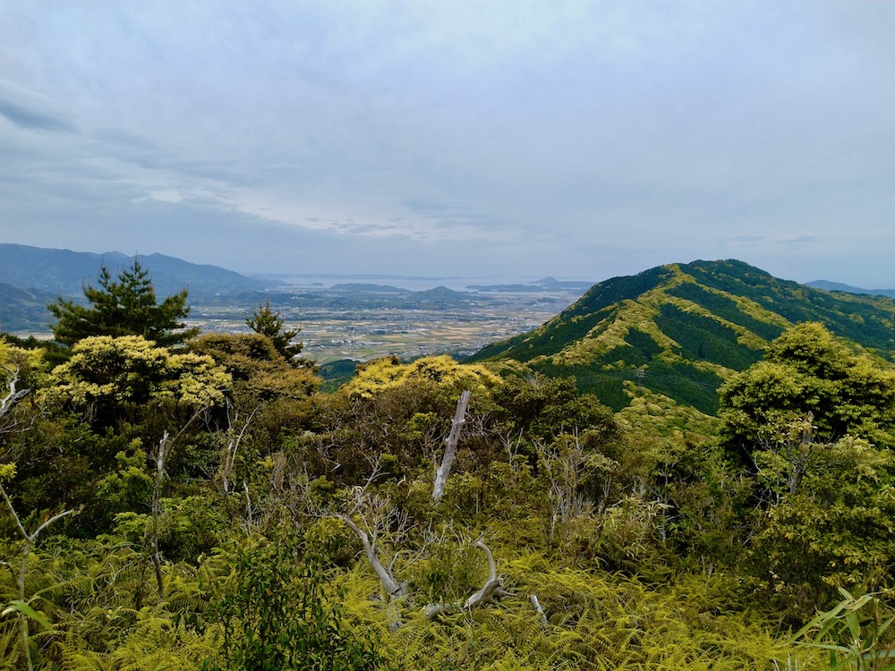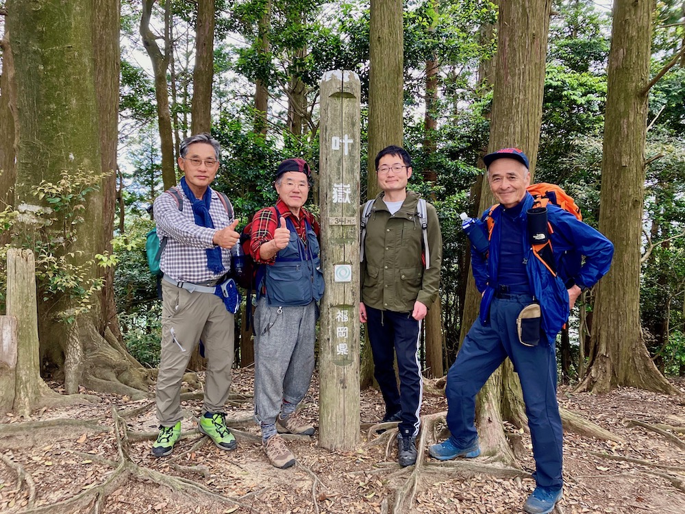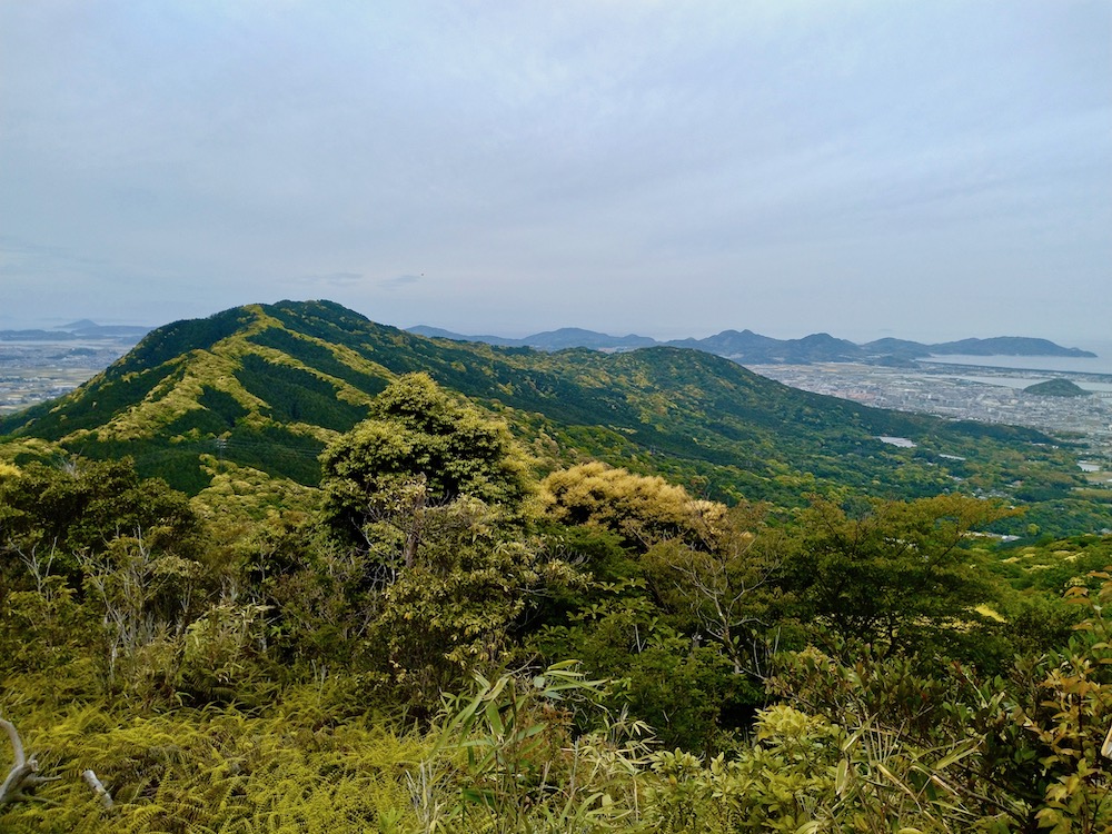 鐘撞山から登り始め、高祖山、高地山、そして叶岳を廻る周回登山だ。最初の鐘撞山かねつきやま(314m)からの眺め 左がゴール叶岳、それに連なる小高い部分が高地山 反対の西側には糸島富士。 小一時間進んで高祖山たかすやま(416m) 北方には能古島と志賀島 高祖山から望む糸島富士 高祖山から高地山が一番歩き応えがある。高地山手前の登りが最後の?関門だ。 次は高地山こうちやま(419m)からの眺望。向かいに見えるのは高祖山。明るい緑は、登山道沿いに続いてる気がするが、単なる気のせい? 左高祖山、右に離れて小高い鐘撞山 高地山のこの眺めを楽しみながらの昼飯最高! 高地山から叶岳かのうだけ(341m)はほぼ下り。そして、叶岳からは完全に下りのみ。疲れは吹っ飛び、ゆとりの表情の記念写真。 福岡市街の景色を心に刻んで、いざ下山! 叶山系周回登山:9km