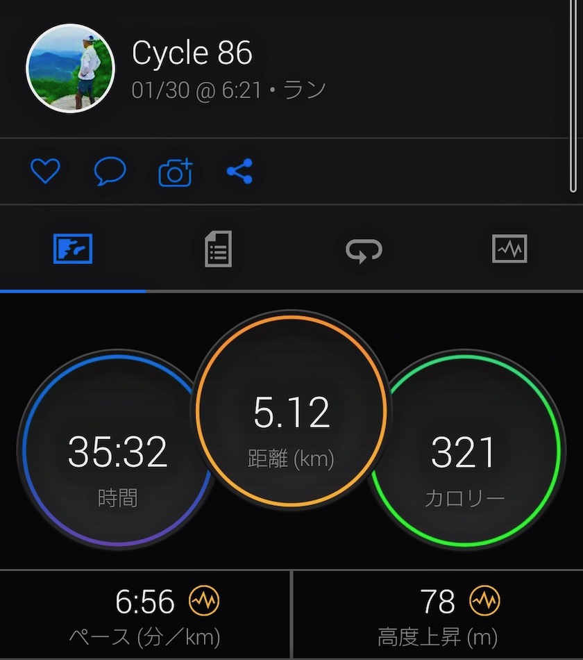 先週 1月 年間累計 ラ ン 40㎞ 140㎞ 140㎞ 自転車 92㎞ 92㎞ 92㎞ 1月もあと1週間だ。先週もまずまずの調子維持。それに最近、月末の定例用務の処理が要領良くなった感じ。効率よく処理するには、月末2日連続の休足を設定、一気に片付けるのが良さそうだ。ギリギリまで仕事先送りの人間には、合っているかもしない。 今月最後の今週は、『雨が降らなければラン』が現実的な目標だ。ついでに、21時就寝もできる限り果たしたい。 今月の目標 ①今日は何する ②ラン月間:170km 自転車月間:150km ③賞金稼ぎ・坐禅(1呼吸1分) ④5分間整頓 ⑤日記・ブログ2日以内更新 ⑥筋トレ習慣化 (Air chair、Roller、Lunge、Side steps) ⑦ウォーミングアップ定着 ⑧21:00 就寝 4:00 起床 ⑨土・日・祝は酒の日 [600(ペース)、535(ペース)等の表記は、 それぞれ1㎞6分00秒、5分35秒で走ること] 今週のムッサン 30日(土) 今朝の空には星が見えた、そして西の空には月。昨夜の予報では今日は確か5℃前後気温高くなる筈だった。しか〜し、手が冷たいのなんの。痛いレベルの寒さだった・・。寅さん、男はつらいね、ランもつらいけど。(笑) ラン出動が遅くなったので、ペースアップ狙う5km走にした。男はつらかったが、諦めず走った先には『超幸せ!』 一緒に喜んでほしい!(笑) 写真のペースの項ご覧を! 656とあるっしょ。つまり1kmを6分56秒ペース。つまり、700を切るペースだった。このペース、確か1年以上ご無沙汰の値である。数年前に目指した600切りは今や夢のまた夢・・。 700切りに絶望感漂う日々だったが、遂に、遂に、遂に 656! 今日は土曜日、これから酒だ、酒じゃ〜!(笑) 因みに、今日のシューズは薄底靴TARTHER Japan。トップレベルを目指すランナーに厚底靴のメリットは大きいのだろうが、万人に当てはまる訳でもあるまい。流行に流されやすい自分が、薄底靴回帰を決断したのは、ある意味で成長かも知れない。 29日(金) ネット情報だと今朝あたりが満月だったらしい。今朝、月とご対面とはならなかったが、月齢の表すものが今ひとつわからない。 それはともかく、 今朝は結構冷えていた。 あっさり妥協、5kmに決めた。体を温めるためペースだけ求めよう。 上智5kmJOG 今日は、多分1年以上ぶりで、Adidas JAPAN薄底靴で走った。 フォームをまともな状態に戻したいとの思いから、藁にすがったと言ってよかろう。蛇足ながら、ランの途中チラリズム降雪、ほんの一瞬って感じだが、チラッと雪が降った。 厚底靴と違って、足裏に衝撃が伝わってくる感じが強い。しか〜し、悪い感じじゃない。玄関には厚底靴が2足と、薄底靴が3足ある。足に異常を感じない限り、この3足を履き潰そう! 28日(木) 新聞によると今日は月齢15.9日らしい。外に出ると西の空に真ん丸の月があった。視力低下で自信なく帰宅後新聞を確かめた。満月か満月少し過ぎだったようだ。美しい月を暫く眺めた。我ながら風流人だね〜!(笑) 月を眺めながら優雅にラン、と思ったら、4km前後で急に催してきた・・。立ち小は緊急時辛うじて許されようが、立ち大は流石にあり得な〜い。最後の1kmは地獄、苦悶の闘いだった。おなじくもんでも、公文の学習なら耐えられるが・・。(笑) 苦悶の方で、5km打ち切り。 午後は市役所訪問で自転車6km走らせたくらいで、大した活動なし。いや〜、くもんの一日でござった。 27日(水) 今日は春。朝も若干暖かめ。ちょっと汗ばんだ。しか〜し、もちろんペースが悪かったのは、自分の実力、決して暑かったからじゃない。(涙)まっ、10km粘ったんだから悩まない! 能天気だから別に悩んでないってのがまた辛いところ・・。 上智10kmJOG 今月残り4日、ランも自転車ももう一顔晴り、最大の願いは最終日31の晴天! 『天よ我に味方し給え!』 26日(火) 『天は我を見放した!』だったか、映画『八甲田山』で雪の中を彷徨う人物の絶望の叫び。 だが今日は言いたかった、『天は我に味方した〜!』 昨日の予報は降水確率90%で、ランは諦めの心境だった。しか〜し、玄関の外の地面は濡れてない! 早速、スタート。我がフォームの酷さに毒突きたい気持ちをぐっと抑えて走る。(笑) ペースも酷いが・・。まっ、何とか10km粘って合格? 上智10kmJOG ゴールし呼吸を整えつつ歩いて1、2分、ポツ、ポツ、雨粒が落ちて来た。『天は我に味方した!』 本当にそう思った。 天気の女神様! 明日も宜しくお願いします。 25日(月) やっと晴れの朝。星も見えた。走る環境は整った。ただ、土日の休足で走りのバランスが悪く気持ちが続かない。1周5kmで打ち止め。 上智5kmJOG:737 月末定例用務ほぼ完了。明日は10km走るべし! と書いた後、天気予報見てガックリ・・。朝方の降水確率90%、、、 24日(日) 起床一番、外の様子を確かめた。雨〜! 途端に気が抜けた・・。今日もラン中止。しか〜し、意外に内心それを喜んでいる自分がいるのかも知れない?? マスクして昼間走る選択もありだが、今のところその気はない。自分にはハードルが高すぎる・・。 月末用務の処理に時間をかけた。明日午前中には完了