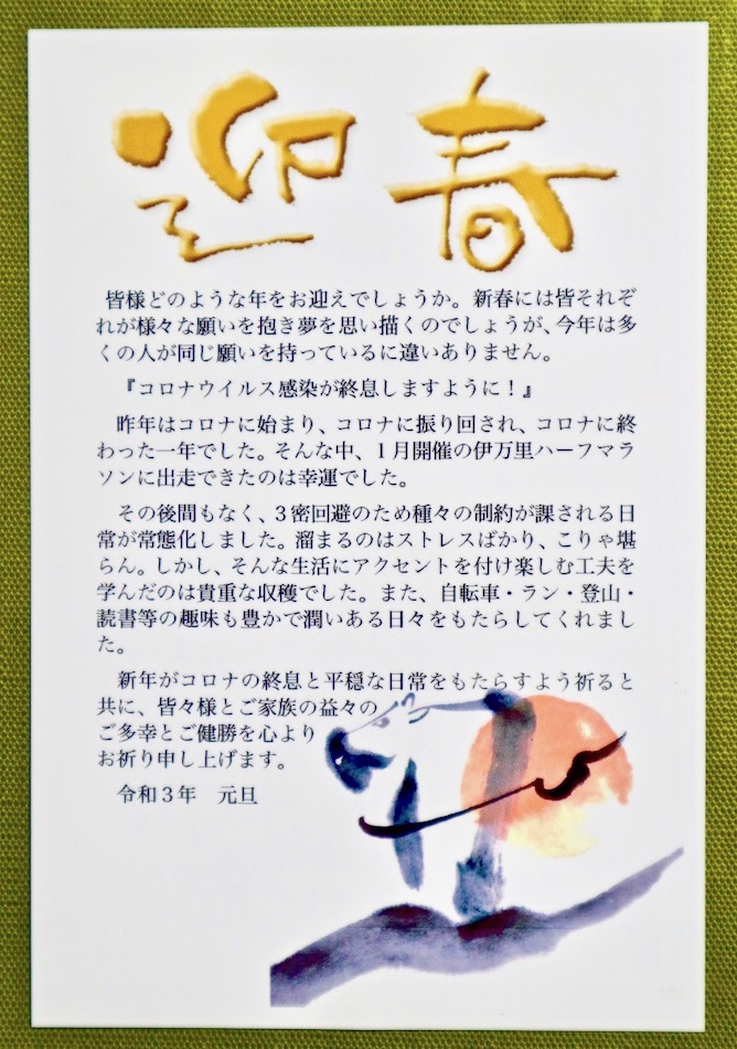 先週 12月 年間累計 ラ ン 40㎞ 183㎞ 1861㎞ 自転車 0㎞ 145㎞ 1256㎞ 先週 1月 年間累計 ラ ン 15㎞ 15㎞ 15㎞ 自転車 0㎞ 0㎞ 0㎞ 先週はムッサンⅢ第100週であり、2020年最終週と2021年第1週にまたがる週だった。2020年は『コロナの年』以外言い様を知らない。我が活動もコロナ仕様。3密避けて健康最優先の手探り活動。いい加減な練習の言い訳には事欠かない。 ランの距離伸びず陰の目標3300kmに遠く及ばなかったが、 長く休止していた自転車再開、そして近場の山歩きに目覚めたことはコロナのもたらした意外な収穫か。 今年令和3年の行方はコロナ情勢次第、計画するのは無駄とも思えるが、東京マラソン2022の開催だけを前提にこれからを計画する。おっと、前提もう一つ、2022年3月を以て町内会長退任。退任後こそ本当の町内活動、と強く思うこの頃だ。 新『今月の目標』がまとまらない。慌てて片付ける性質のものではなかろう。今週中には設定の方向。 [600(ペース)、535(ペース)等の表記は、 それぞれ1㎞6分00秒、5分35秒で走ること] 今週のムッサン 9日(土) 今朝のランは昨夜時点で諦めていたが、念のため朝一で道路確認した。ちょ、ちょ、超ラッキー! 一部凍結してるが、新聞配達済みだし何とか走れそう。笑筋稼ぎ、坐禅、ストレッチ等のルーチンをこなし、いざっ出撃! しか〜し、出動を後悔するのに時間は掛からなかった・・。所々で歩道全面凍結。尚か〜つ、動・植物園からの下り坂になると、歩道も車道も黒く凍結してる・・。 城南線も歩道は凍結、車道を通るのは流石に、、コースの¼〜⅓は歩いただろうか。ひやっひやっ、そして冷え冷えの朝ランだったがやった感も大きい。やったぜぃ! 上智5kmJOG 今日の最大の、否望外の課題は片付けた! 後は気ままに、気楽にやる! 8日(金) 走れるかな〜? 期待半分の朝。 甘〜い期待だった・・。道路はご覧の状態。 明日まで休足を覚悟、机上の作業と室内トレーニングに専念するとしよう! 因みに、休足の原則は1週または10日練習後に1日休足、一月に最大5日休足。 7日(木) 朝ちょっと迷った。雨が降っているし寒い。しか〜し、小雨を幸い5km限定で走った。 間もなく雨は上がったが次は強風、 しかも向かい風、尚か〜つ、上り坂、坂のピークでホット一息。とは行かない。強風の次はアラレでんがな・・。踏んだり蹴ったりの朝ランだったが、走ったことで気分は良い。 上智5kmJOG 小・中学校は始業式。あいさつ活動も再開したが、時折雪の舞う中を登校する姿に声援を送りたい気持ちだったね。 やがて昼頃には雪が強まり、我が家の庭木も雪化粧。 6日(水) 今日は新年初の完全休足。2日ほど前から左大腿内部の筋肉にピリピリチクチクと嫌な痛みが走るのだ。怪我をしないうちに一旦休足する。 原因は多分筋トレだろう。空気椅子にローラーで疲れを溜め込んだか。その上、新たにランジまで始めたのだから、、。歳の程を考えろってことだろう。(笑) 休足は正解だと思うが、筋トレからランまで全て休むと、他の全てにも気の緩みが広がる・・。以後気を付けるとしよう。 5日(火) 今朝、走り始めたのは6時過ぎ・・。7時前には走り終わる原則だが、敢えて10kmを目指した。 スピード抑え後半のペースアップを狙った。 上智10kmJOG ほぼ狙い通りの走り。その後、今年の重点目標である体幹を鍛える筋トレに取り組んだが、厳しい闘いになる予感・・。 年末年始の飲み放題期間終了、昨日『土・日酒の日』に立ち戻ったが何らストレスを感じないのに安心した。アル中の心配は無用のようだ。(笑) 何ヶ月ぶりかで読書以外の座学に手を染めたのも嬉しい。問題は果たして継続できるか・・。(冷汗) 4日(月) 年末年始のアルコール解禁は昨日で終了。今日から『土・日酒の日』に復帰。現役世代に合わせ全てを普段の生活に戻す。 で、今朝はランで開始。 上智5kmJOG 今朝のペースまずまずだが、それでも1km7分より遅い。キロ7分を切れなくなってもう1年以上になる・・。今年の、いや新春の最初の大きな目標は上智コースでの7分切り。公表が憚られるレベルの話でお恥ずかしい・・。 3日(日) 朝、空には白っぽい月が懸かっていた。今日は好天に恵まれるのだろうか。 気温低いが手指に痛みを覚えるほどじゃなく当然10km走を目指す。そして淡々と達成。 上智10kmJOG ランの後は箱根駅伝復路観戦。印象に残ったのは駒大の大逆転総合優勝に青学の復路優勝。 今日中に月間目標決定すべきところだが、未だ決定に到らない。今週中の決定を目指す。