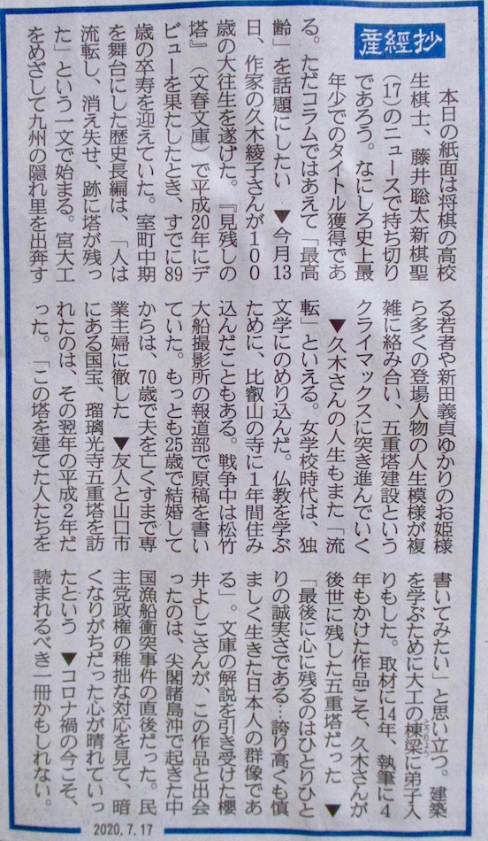 先週 7月 年間累計 ラ ン 25㎞ 115㎞ 1133㎞ 自転車 0㎞ 0㎞ 69㎞ [600(ペース)、535(ペース)等の表記は、 それぞれ1㎞6分00秒、5分35秒で走ること] 今週のムッサン 1日(土) 上智5kmJOG 予定通りなら、帰宅後福岡空港へ急行し北海道に向かう筈だが。幌尻岳登山、武漢ウイルスでキャンセル・・。 来年?再来年?の楽しみにしなさいってことか? マラソンも次はいつになるやら・・。自粛生活、いつまで続くんだろう? 今月はマスク着用で厳しい夏になりそうだ。皆さんご自愛下さいね。 31日(金) 朝一上智5kmJOG。これで気持ちは楽になる。残り時間が活用できてないが、人間簡単に変われないもの。 午後は読書。『心揺るがす講演を読む』を読んでその中の白駒妃登美なる人物の『人生に悩んだら日本史に聞こう』に興味が湧いた。福岡在住の女性らしい。 いよいよ明日から8月。 30日(木) 今日も朝一で上智5kmJOG。 午後、市役所を訪ね要望書提出陳情。これまでの暖簾に腕押し的対応に遺憾の意を伝え、市の取るべき姿勢について語り訴えた。果たして思いがどれだけ伝わったか? 今は市の回答書を待つのみだが、今日の梅雨明け晴天の空と同じ展開は期待でき・・。(涙) 29日(水) 今日はこの梅雨最後の強雨となるのだろうか。土砂降り状態が結構続いた。そんな中、朝ラン出動できてラッキーだった。 上智5kmJOG その後は雨を幸い、 散らかり放題の机上整理と藤井棋聖の順位戦B級2組の対局を観戦。またまた勝利で順位戦3連勝! 28日(火) 久しぶり超熟睡。目覚めてみれば早5時半。即朝ラン中止、休足を決定・・。時折強い雨降る一日、せめて区役所訪問がてらウォーキングとでかけたが、今日はついてない。 家を出て物の数分歩いたところで車から名前を呼ばれた。誰?誰?って感じでしたよ。まさか顔見知りの区役所職員とは・・! こんなことあるんだ! 意志薄弱人間は、あっさり提出書類託してウォーキング中止。まっ、こんな偶然めったにあるこっちゃなし、今日はこれで佳し! 27日(月) 夜来の雨は出動前には上がった。ありがたいことだが、体感スピードに実際の走りが全然伴わない。ランと言うより早足歩き・・? 上智5kmJOG ガーミン相変わらずサイトにアクセスできない・・。しかし、雑務をいくつか片付けて、断続的な雨にも関わらず気分良好!? 26日(日) 今年もいつか梅雨明けになるのだろう。多分・・。 全く以てジメジメ天気にはうんざりだ。朝の5km走で一日、そして一週が始まったのが救いである。 上智5kmJOG しか〜し、7月に台風の発生・接近は無さそうだが、これは椿事じゃなかろうか!? 今年の天気で唯一ありがたい点だが、8月に半沢直樹ってのはゴメンである! 午後町内会の用務に集中。今月もなんとか切り抜けた。