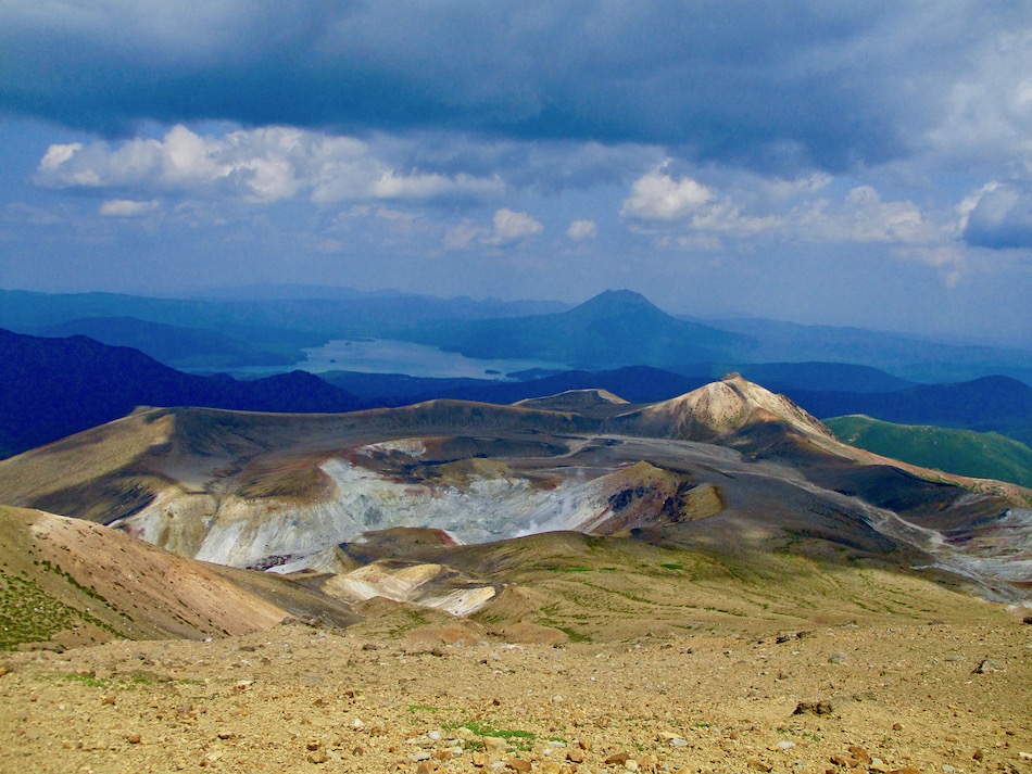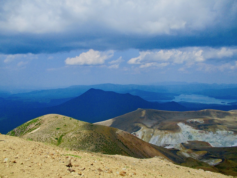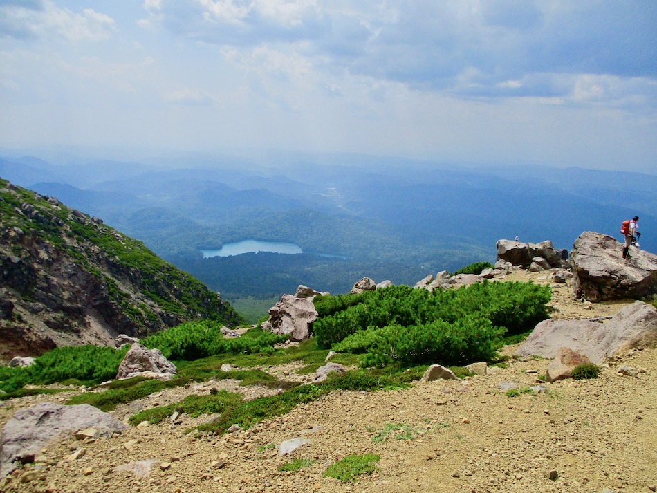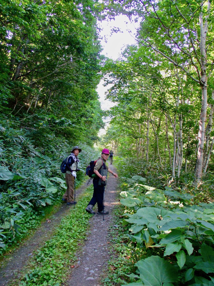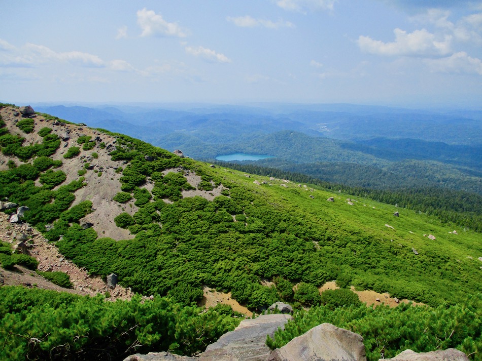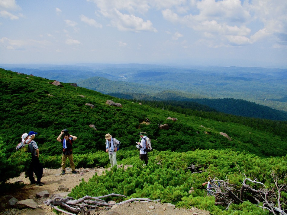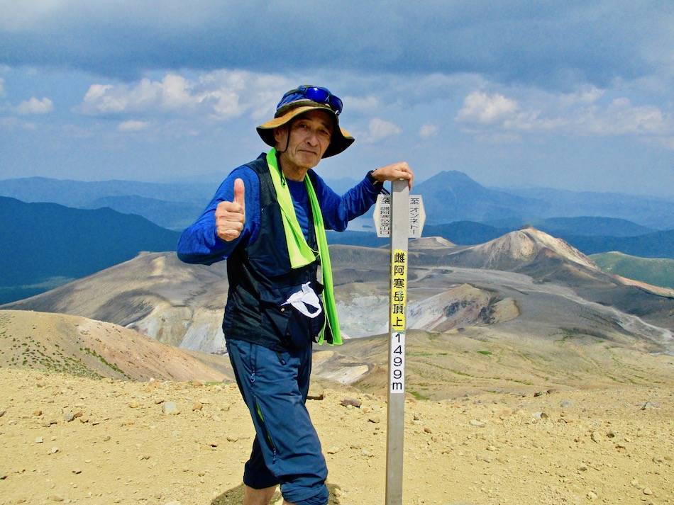 が実質的に北海道登山最終日である。 今日も桂田の朝食で一日は始まった。 食事後、車を走らせること約2時間、雌阿寒温泉側登山口 に着いたが、その途中で奇跡が起こった。 10年前自転車で日本一周した際、美幌峠から網走へ走り 下りた白樺並木の道を横切ったのだ。一瞬のことだが、直ぐ に分かった。まさに奇跡!懐かしさに胸が熱くなった。しか 〜し、感動の余り写真を撮り忘れたのは、、、残念・・。 閑話休題、雌阿寒岳登山のことである。登山口に着くや即 高い松の樹林に足を踏み入れる。スタート直後から結構な傾 斜の上りが続く。 斜里岳・羅臼岳登山で筋肉疲労気味、かつ、足の爪を傷め た身には辛い。昨日に続いてカメラ持ち腐れ。 しかし、汗でグショグショになり登る中にハイマツが徐々 に低くなり、見晴らしが良くなってきた。カメラの出番到来 である! 大きな沢地を渡った4合目あたりから傾斜は更に急になり 苦戦を強いられたが、松の丈は更に低くなって、素晴らしい 眺望に疲れも吹き飛ぶ。 神秘的な色合いのオンネトーが見えてくると、もう疲れな ど忘れて、標高を稼ぐとともに変わる景色に夢中になった。 次の写真は9合目手前あたりか? 既にマツは姿を消し高 山植物が所々、あとは岩があるばかりである。稜線も近い。 稜線に出てまもなく、別世界の光景が待ち受けていた。噴 気孔からの音が響き、火口壁に囲まれた底には赤沼がある。 底知れない爆発的なエネルギーを感じる。ふと、御嶽山噴火 の記憶が蘇った。 火口沿いの稜線を、時計回りに更に進む。 北に遠く阿寒湖と雄阿寒岳が見える。 そして、標高1499m 雌阿寒岳頂上。 頂上の先には更に道が続き登山者の姿も見える。残念なが ら、我々はいま来た道を引き返す。 引き返す前に、火口壁際から火口を覗いた。そこには赤沼 のある火口丘から一段高い火口原が広がり、目玉のように青 沼がある。なんとも不思議な光景だ。目玉の先には噴煙が上 がり、その奥には阿寒富士が鎮座していた。 後ろ髪を引かれる思いを振り払い、別世界を後にした。 本日のルート・距離 雌阿寒岳登山:7km 北海道登山旅。斜里岳、羅臼岳、雌阿寒岳の三山登頂、美 幌峠〜網走の白樺並木の道との10年ぶりの遭遇、感動満載 大満足の5日間だった。 しかし、何しろ自然豊かなでっかいどう、脚力不足もあり その魅力を味わい尽くしたとは言い難い。体を鍛え直し、い つの日か北海道に再チャレンジしたいもの。 最後に、この5日間を共有した友に心から感謝したい。全 ては友の存在あってこそ実現したことだから。