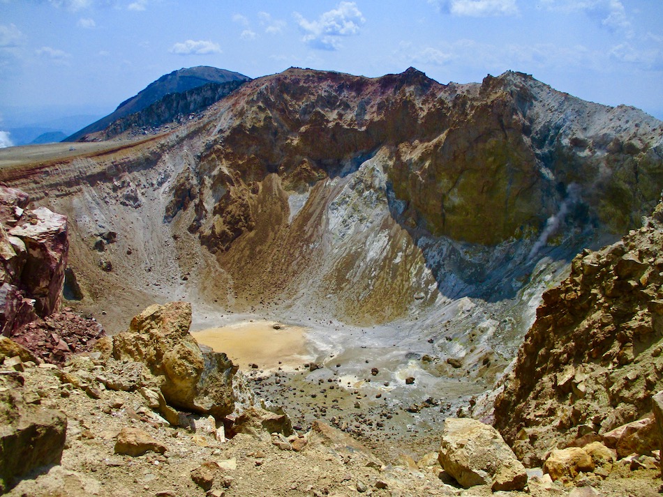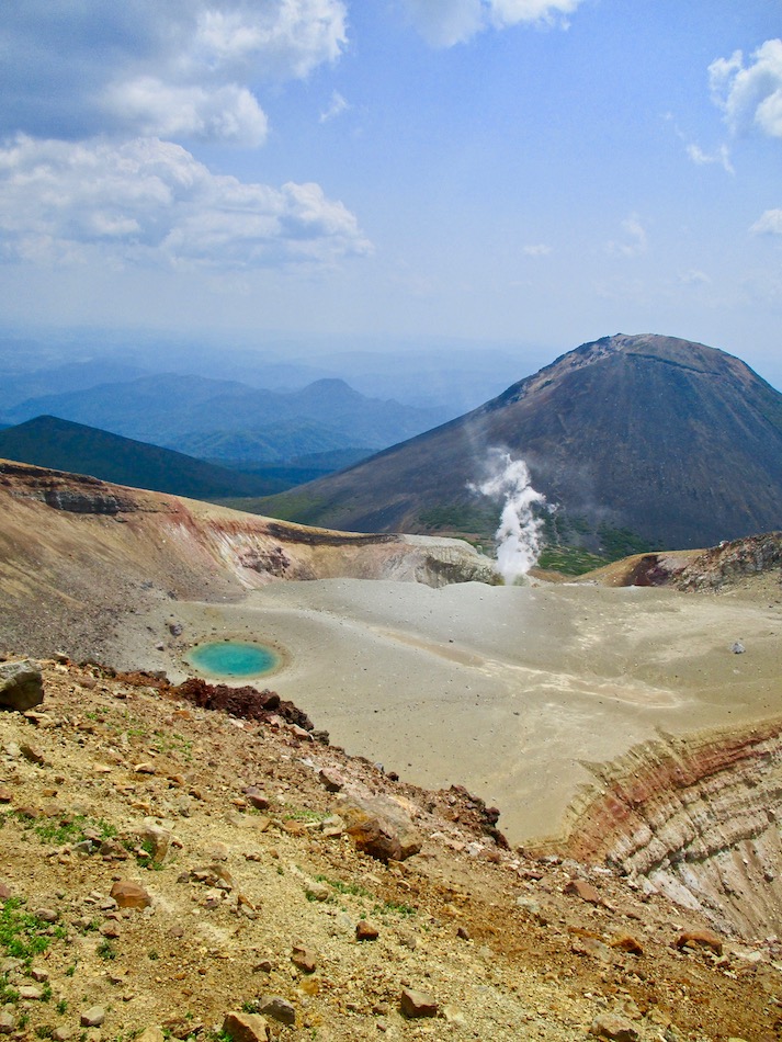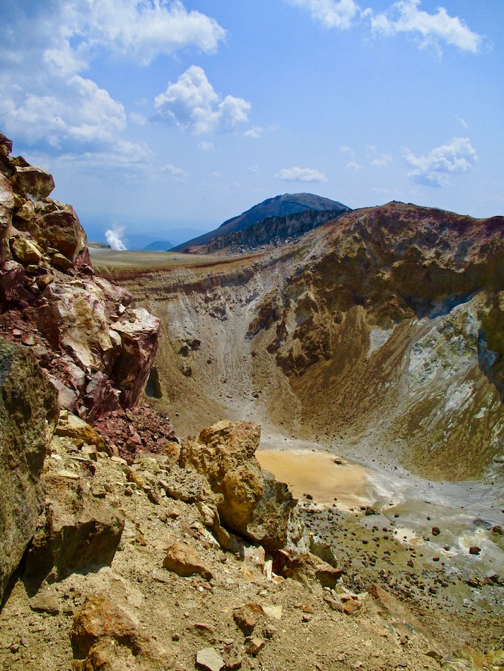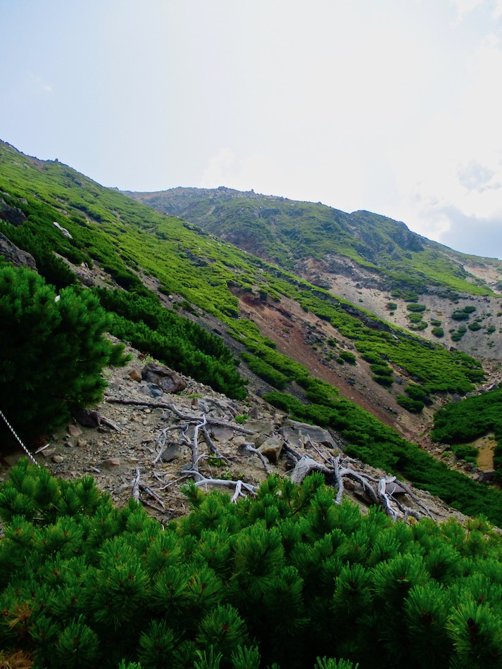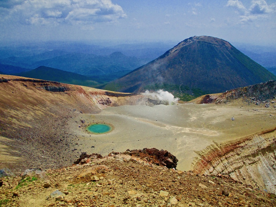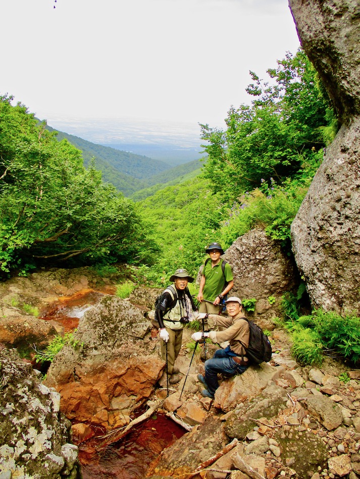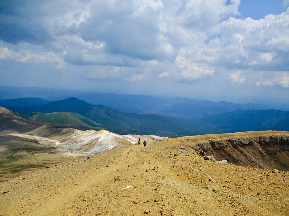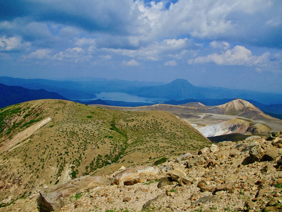 が実質的に北海道登山最終日である。 今日も桂田の朝食で一日は始まった。 食事後、車を走らせること約2時間、雌阿寒温泉側登山口 に着いたが、その途中で奇跡が起こった。 10年前自転車で日本一周した際、美幌峠から網走へ走り 下りた白樺並木の道を横切ったのだ。一瞬のことだが、直ぐ に分かった。まさに奇跡!懐かしさに胸が熱くなった。しか 〜し、感動の余り写真を撮り忘れたのは、、、残念・・。 閑話休題、雌阿寒岳登山のことである。登山口に着くや即 高い松の樹林に足を踏み入れる。スタート直後から結構な傾 斜の上りが続く。 斜里岳・羅臼岳登山で筋肉疲労気味、かつ、足の爪を傷め た身には辛い。昨日に続いてカメラ持ち腐れ。 しかし、汗でグショグショになり登る中にハイマツが徐々 に低くなり、見晴らしが良くなってきた。カメラの出番到来 である! 大きな沢地を渡った4合目あたりから傾斜は更に急になり 苦戦を強いられたが、松の丈は更に低くなって、素晴らしい 眺望に疲れも吹き飛ぶ。 神秘的な色合いのオンネトーが見えてくると、もう疲れな ど忘れて、標高を稼ぐとともに変わる景色に夢中になった。 次の写真は9合目手前あたりか? 既にマツは姿を消し高 山植物が所々、あとは岩があるばかりである。稜線も近い。 稜線に出てまもなく、別世界の光景が待ち受けていた。噴 気孔からの音が響き、火口壁に囲まれた底には赤沼がある。 底知れない爆発的なエネルギーを感じる。ふと、御嶽山噴火 の記憶が蘇った。 火口沿いの稜線を、時計回りに更に進む。 北に遠く阿寒湖と雄阿寒岳が見える。 そして、標高1499m 雌阿寒岳頂上。 頂上の先には更に道が続き登山者の姿も見える。残念なが ら、我々はいま来た道を引き返す。 引き返す前に、火口壁際から火口を覗いた。そこには赤沼 のある火口丘から一段高い火口原が広がり、目玉のように青 沼がある。なんとも不思議な光景だ。目玉の先には噴煙が上 がり、その奥には阿寒富士が鎮座していた。 後ろ髪を引かれる思いを振り払い、別世界を後にした。 本日のルート・距離 雌阿寒岳登山:7km 北海道登山旅。斜里岳、羅臼岳、雌阿寒岳の三山登頂、美 幌峠〜網走の白樺並木の道との10年ぶりの遭遇、感動満載 大満足の5日間だった。 しかし、何しろ自然豊かなでっかいどう、脚力不足もあり その魅力を味わい尽くしたとは言い難い。体を鍛え直し、い つの日か北海道に再チャレンジしたいもの。 最後に、この5日間を共有した友に心から感謝したい。全 ては友の存在あってこそ実現したことだから。