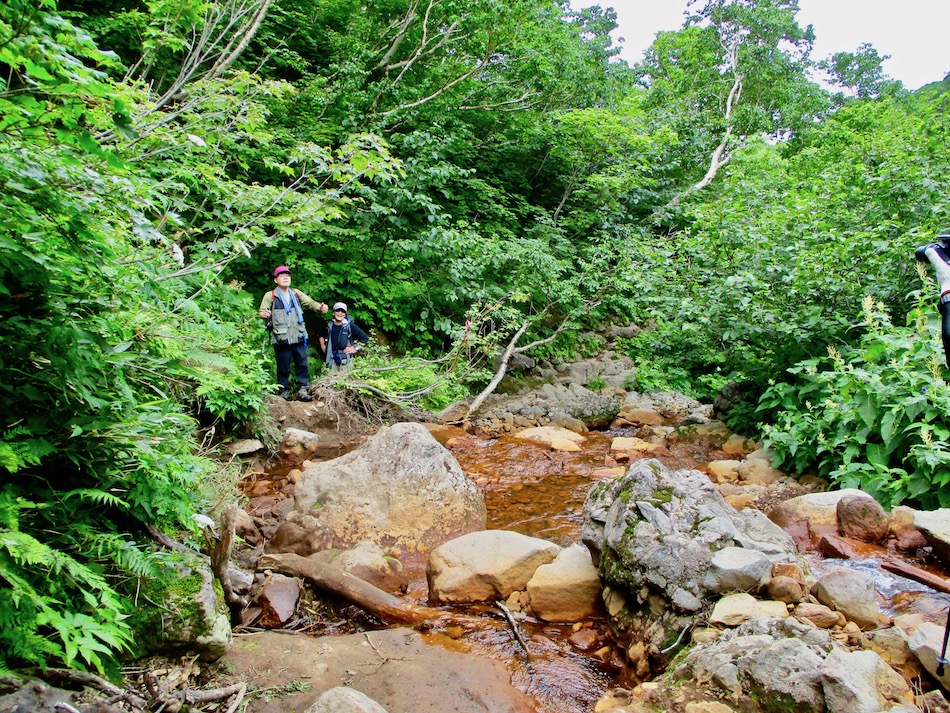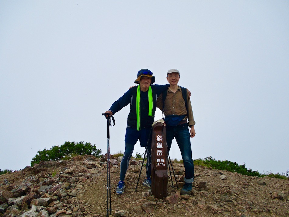 2時間半ほどで新千歳空港へ。北海道はでっかいどう! 新千歳に福岡組、羽田野・中村・村上、関東組、木内・園 田・山崎の6人が全員集合! 夕方6時過ぎレンタカーを疾 駆させ、深夜零時直前斜里のホテル到着。 睡眠は5時間ほどだったろうか、翌朝斜里岳を目指した。 車窓から望む斜里岳の威容に圧倒される思い。 登山口は清里町『清岳荘(せいがくそう)』 いざ出発! 約一時間で下二股、この先は滝の連続する沢伝いの旧道を 足を滑らせないよう、時にロープを頼りに歩を進める。 旧道を歩くこと更に約1時間で上二股で新道と合流。この 後、低い緑のトンネルの中にがれ場が続く。最後に待ち受け るのは胸突八丁。 やっとの思いで上り抜けると馬ノ背、ここから更にハイマ ツの中を進んで山頂を目指す。これで頂上と思ったが、、、 山頂と思った所には白い祠があり、裏手に回ると本物の山 頂に至る最後の急斜面が続く。 山頂はガスって、あまり見晴らしが利かず残念・・。 しかし、祠のあたりまで下ると景色もまずまず。 時折、雨粒が落ちる中、馬ノ背から上二股へ下る。 上二股からは、沢沿いの旧道を避けて熊見峠を経由する新 道を下った。しか〜し、やや遠回りで距離的には長く、新道 だけに結構しんどうかった。(笑) 斜里岳方向を振り返る。いや〜、よく歩いたもんだ。 熊見峠から先、下二股までの永遠に続くかと思える下り坂 に苦しんだこと、更に下二股から清岳荘まで雨の中を歩く羽 目になったことは、沢に流してしまった! ただ、ウトロの国民宿舎桂田のビール・じゃがいも焼酎と 料理に心身が癒やされたことだけを記憶に留めよう。 本日のルート・距離 斜里岳登山:12km