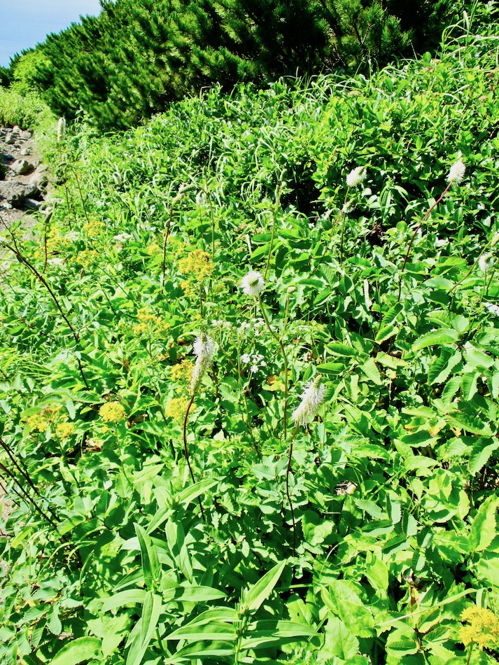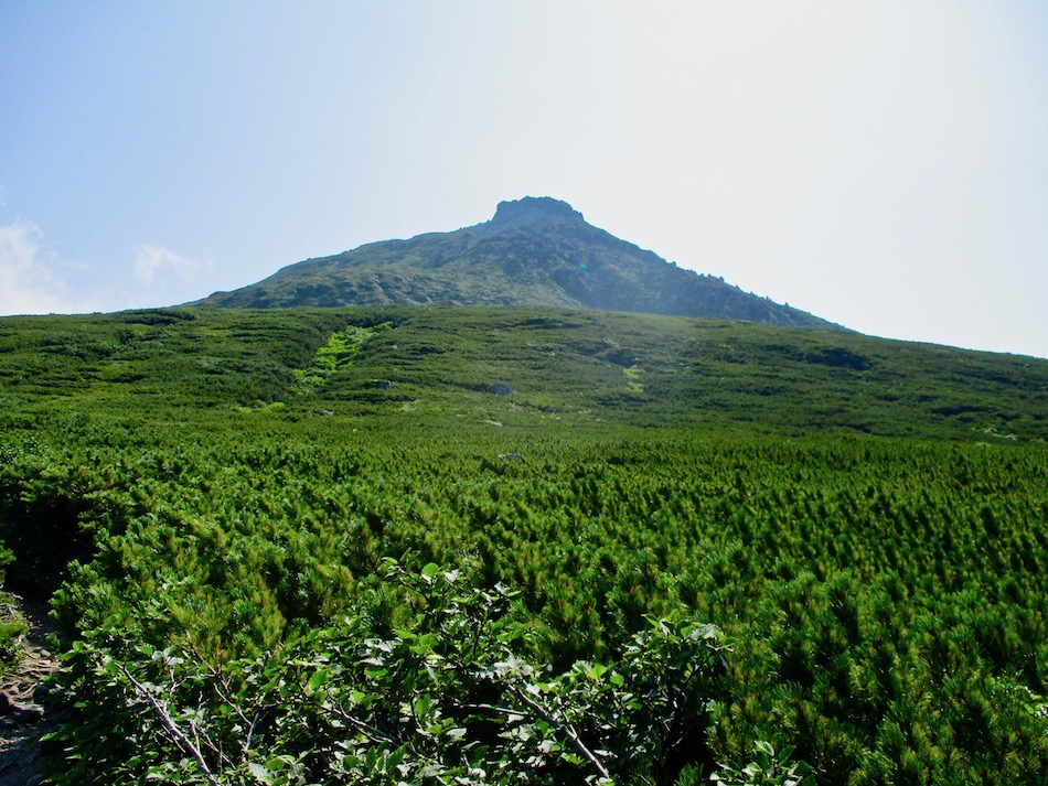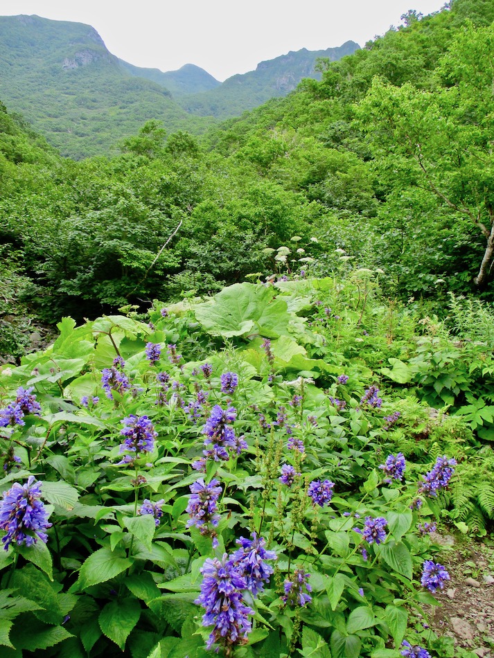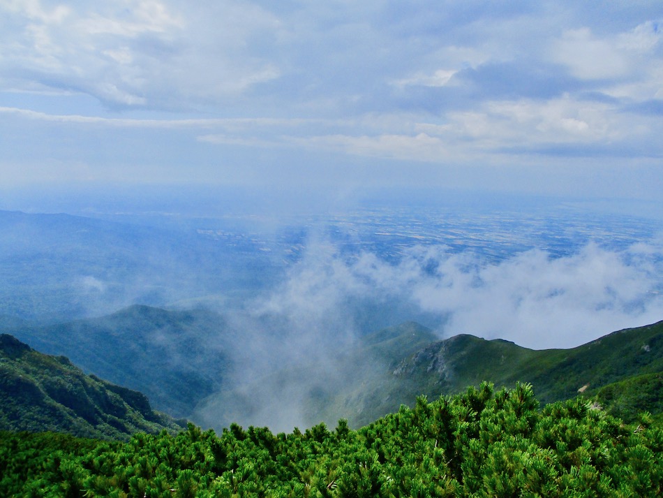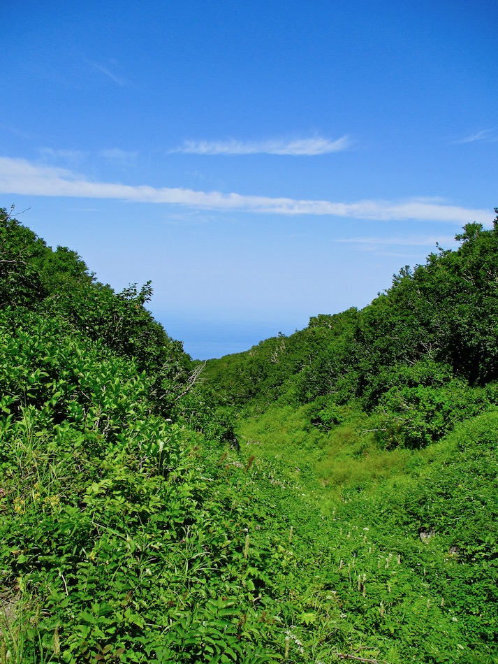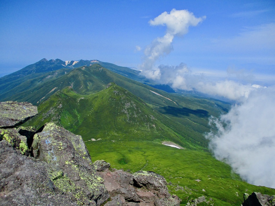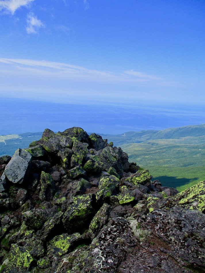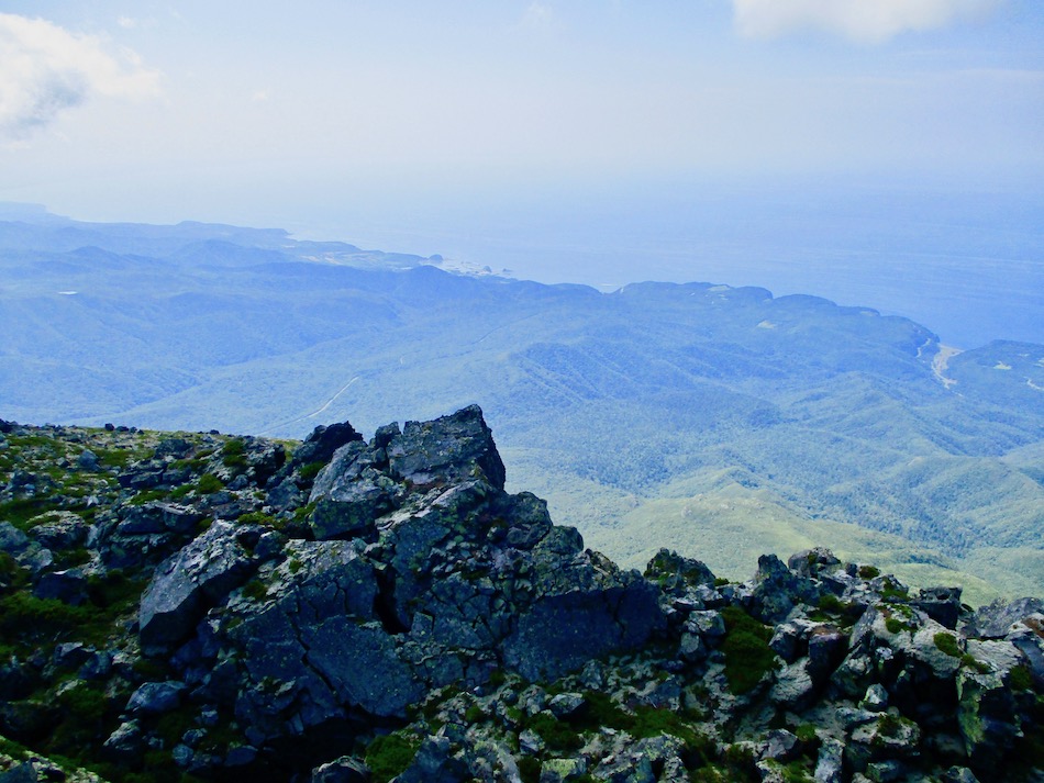 ら。昨夜は店内での宴会だったが、今日はテラスで食事。ト レー2つで一人分、美味しいけれど量が圧倒的過ぎ! 眼前にはオホーツクの海が広がる。 爽やかな空気もご馳走だ。 8時半前、標高 230mにある木下小屋の羅臼岳登山口から 入山、標高1661mの羅臼岳山頂を目指す。 広葉樹林の中の登山道に入ると、すぐに急斜面をつづら折 りの登山道が続く。眺望の利かない厳しい登りに汗が滴る。 昨日の斜里岳で疲れた足は重く、登頂への不安と熊との遭 遇への不安が重くのしかかる。なんたってウトロでは連日飼 い犬が熊の餌食になっているのだ・・。(冷汗) しかも、狭い登山道のあちこちに昆虫を絡める蜘蛛の巣の 如く木々が低く枝を張っている。昨日の斜里で20回、今日 は30回以上頭をぶつけ、顔面をぶつけた。ショックで頭の 切れが良くなるものなら我慢もするが・・。 こんな状況で写真を撮ることに頭が回らなかった。弥三吉 水・銀冷水の2つの水場でも冷たい甘露水を頂いただけ。 カメラを手にしたのは、羅臼平に続く大沢に出てからだ。 羅臼平が近づくにつれ、いろいろな野草が目を楽しませて くれる。特に、鮮やかな青のリンドウに目を奪われた。 大沢を登り切ると標高1345mの羅臼平、ここで登山道は左 右に分かれる。 左に折れると三ツ峰を経て硫黄山へ至る。 右へ進んだ先に聳えるのが羅臼岳だ! 不安一杯、途中離 脱も選択肢だったが、ここまで来たら!! 軽く空腹を満たし、温かいコーヒーを飲んで遠い山頂に向 かう。『レッツゴー!』 しか〜し、最初の松の絨毯を縫って歩くのは大して負担で なかったが、その先に最大の試練が待ち受けていた。再びカ メラは山頂まで出番なしになった・・。 まるで、岩山登山だった。しかも、岩はでかく、傾斜は急 峻。時に四つん這いになり、時に岩に縋り付いて登った。写 真より身の安全確保が最優先。 もっとも、無事帰宅した今は写真の少なさを残念に思う自 分がいる。ったく〜〜、贅沢にもほどがあるぜ・・。 しかし、標高差1400mを登り切り、半ば無理かと思ってい た難敵羅臼岳制覇! その山頂から三ツ峰、硫黄山方向を望む景色。 国後島・太平洋側は雲の下・・。 オホーツク海側は ウトロ『桂田』方向を見下ろす眺望。 不思議なことに、身の危険さえ覚えながら登った岩場だっ たが、降る時にはゆとりがあった。視野が広がるからだろう か、進むべきルートが自ずから見えてくる感じだ。 従って、再びカメラ登場。高山の宝石をご覧あれ。 木の枝との数多のぶつかり稽古の痛み、降りの衝撃に黒ず み死んでしまった足の爪、強烈な西陽、全てに耐えながら山 を降りた。 その間、我が頭を独占したのは露天風呂! 風呂嫌いの我 が想いは、ビールでなく風呂に溺れたのだ。 写真の少なさに反比例して、思い出多き羅臼登山だった。 本日のルート・距離 羅臼岳登山:15km