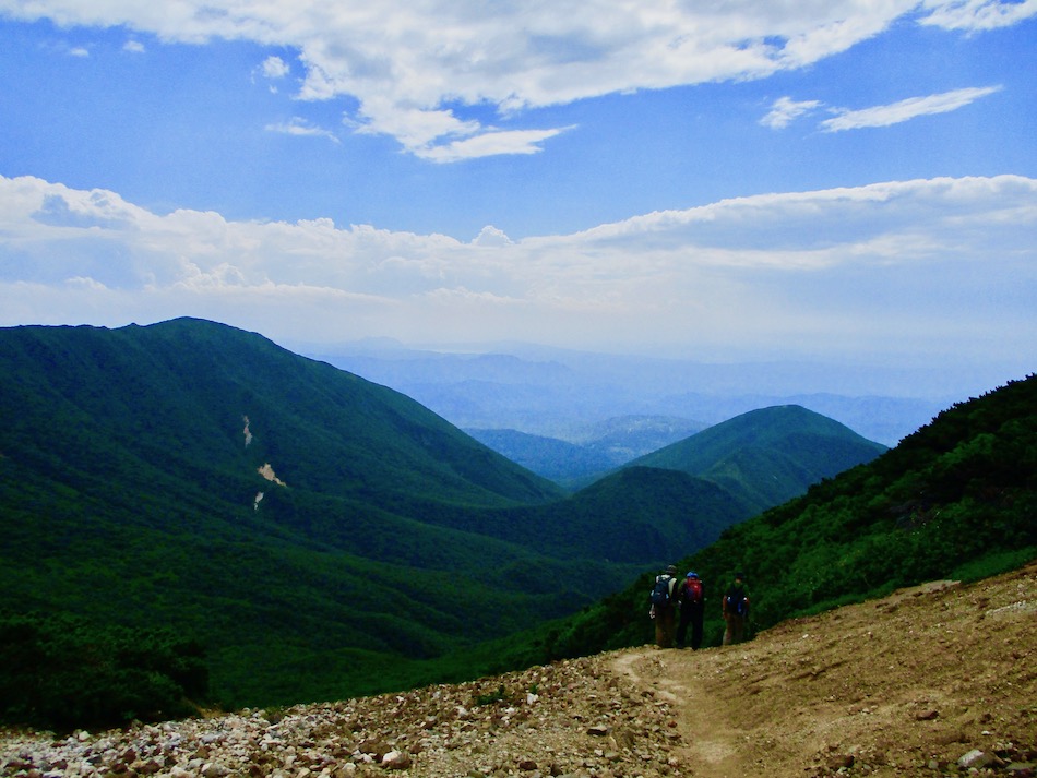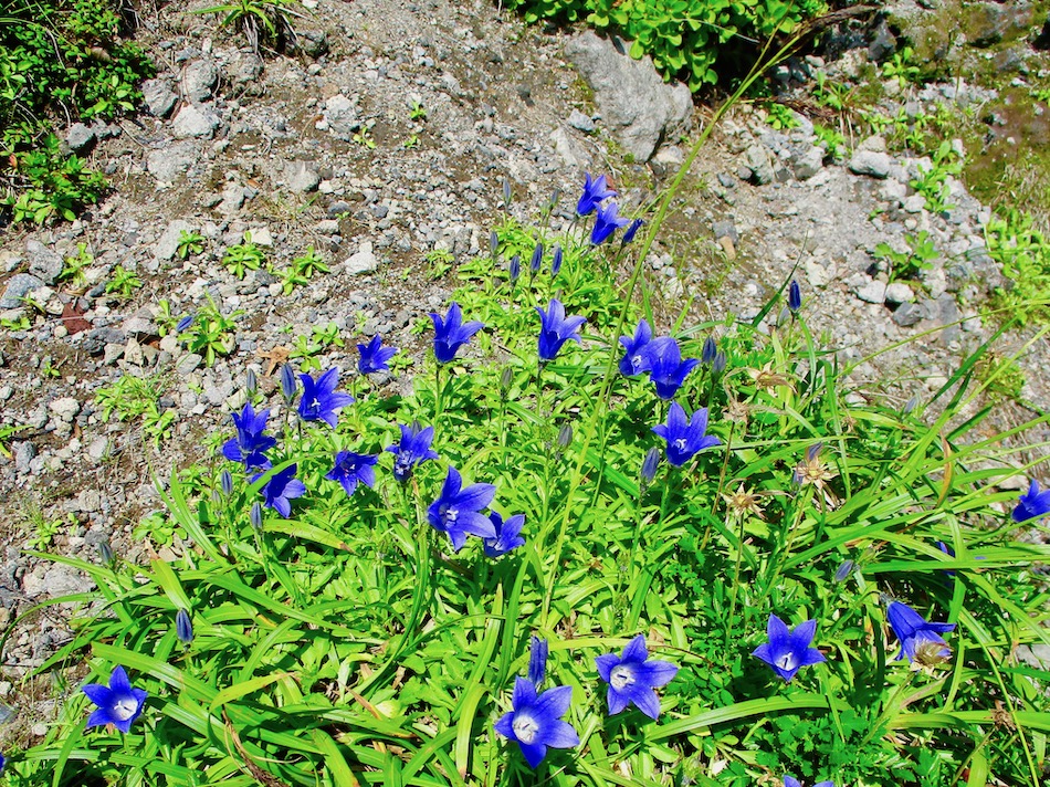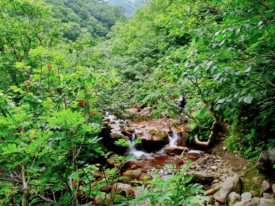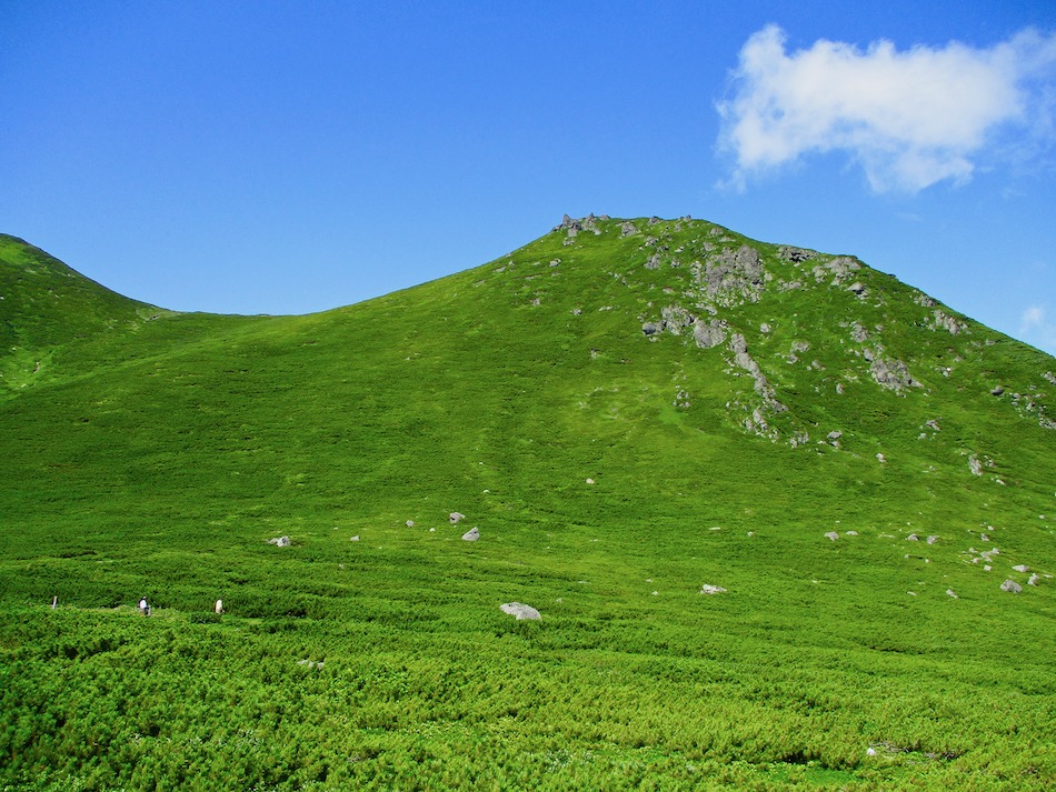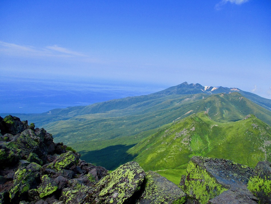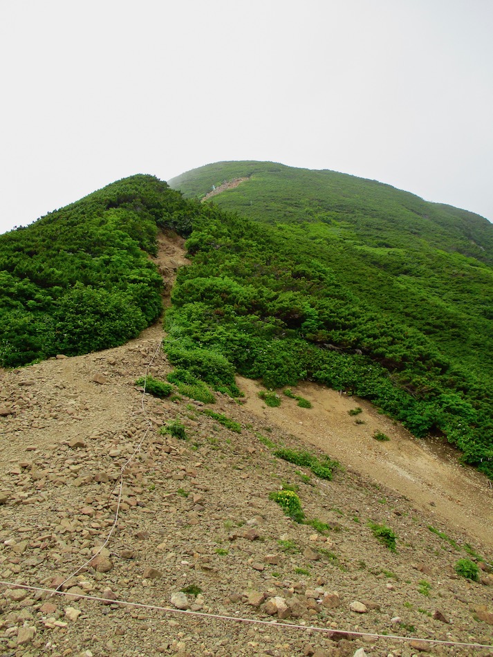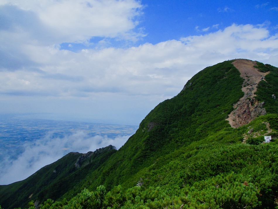ら。昨夜は店内での宴会だったが、今日はテラスで食事。ト レー2つで一人分、美味しいけれど量が圧倒的過ぎ! 眼前にはオホーツクの海が広がる。 爽やかな空気もご馳走だ。 8時半前、標高 230mにある木下小屋の羅臼岳登山口から 入山、標高1661mの羅臼岳山頂を目指す。 広葉樹林の中の登山道に入ると、すぐに急斜面をつづら折 りの登山道が続く。眺望の利かない厳しい登りに汗が滴る。 昨日の斜里岳で疲れた足は重く、登頂への不安と熊との遭 遇への不安が重くのしかかる。なんたってウトロでは連日飼 い犬が熊の餌食になっているのだ・・。(冷汗) しかも、狭い登山道のあちこちに昆虫を絡める蜘蛛の巣の 如く木々が低く枝を張っている。昨日の斜里で20回、今日 は30回以上頭をぶつけ、顔面をぶつけた。ショックで頭の 切れが良くなるものなら我慢もするが・・。 こんな状況で写真を撮ることに頭が回らなかった。弥三吉 水・銀冷水の2つの水場でも冷たい甘露水を頂いただけ。 カメラを手にしたのは、羅臼平に続く大沢に出てからだ。 羅臼平が近づくにつれ、いろいろな野草が目を楽しませて くれる。特に、鮮やかな青のリンドウに目を奪われた。 大沢を登り切ると標高1345mの羅臼平、ここで登山道は左 右に分かれる。 左に折れると三ツ峰を経て硫黄山へ至る。 右へ進んだ先に聳えるのが羅臼岳だ! 不安一杯、途中離 脱も選択肢だったが、ここまで来たら!! 軽く空腹を満たし、温かいコーヒーを飲んで遠い山頂に向 かう。『レッツゴー!』 しか〜し、最初の松の絨毯を縫って歩くのは大して負担で なかったが、その先に最大の試練が待ち受けていた。再びカ メラは山頂まで出番なしになった・・。 まるで、岩山登山だった。しかも、岩はでかく、傾斜は急 峻。時に四つん這いになり、時に岩に縋り付いて登った。写 真より身の安全確保が最優先。 もっとも、無事帰宅した今は写真の少なさを残念に思う自 分がいる。ったく〜〜、贅沢にもほどがあるぜ・・。 しかし、標高差1400mを登り切り、半ば無理かと思ってい た難敵羅臼岳制覇! その山頂から三ツ峰、硫黄山方向を望む景色。 国後島・太平洋側は雲の下・・。 オホーツク海側は ウトロ『桂田』方向を見下ろす眺望。 不思議なことに、身の危険さえ覚えながら登った岩場だっ たが、降る時にはゆとりがあった。視野が広がるからだろう か、進むべきルートが自ずから見えてくる感じだ。 従って、再びカメラ登場。高山の宝石をご覧あれ。 木の枝との数多のぶつかり稽古の痛み、降りの衝撃に黒ず み死んでしまった足の爪、強烈な西陽、全てに耐えながら山 を降りた。 その間、我が頭を独占したのは露天風呂! 風呂嫌いの我 が想いは、ビールでなく風呂に溺れたのだ。 写真の少なさに反比例して、思い出多き羅臼登山だった。 本日のルート・距離 羅臼岳登山:15km