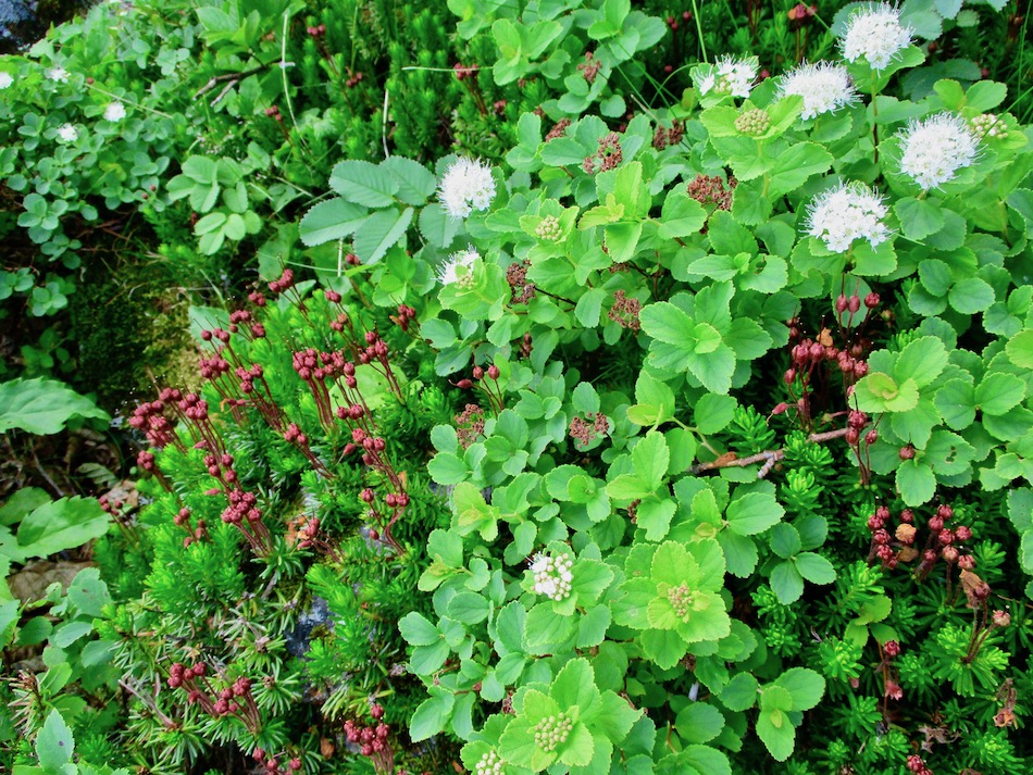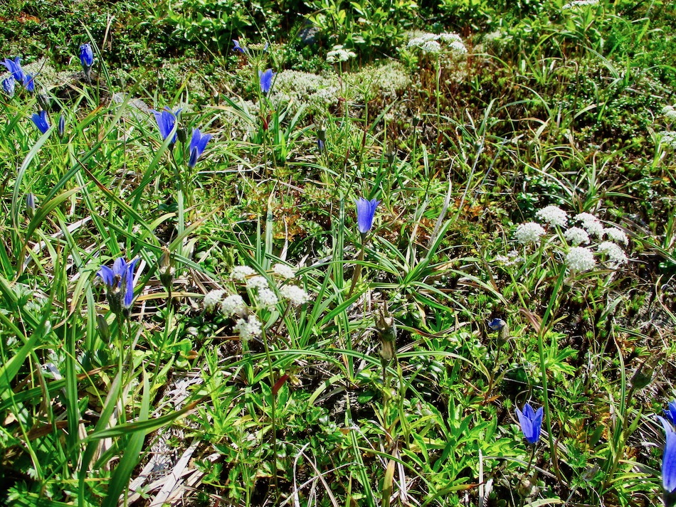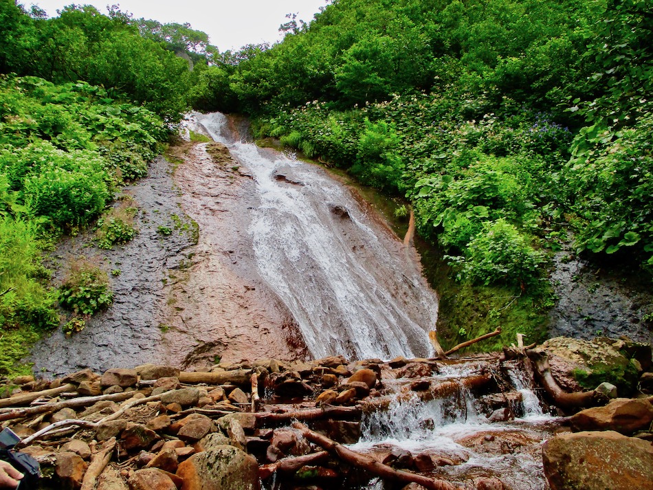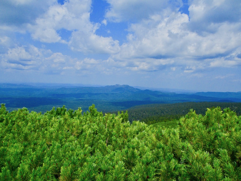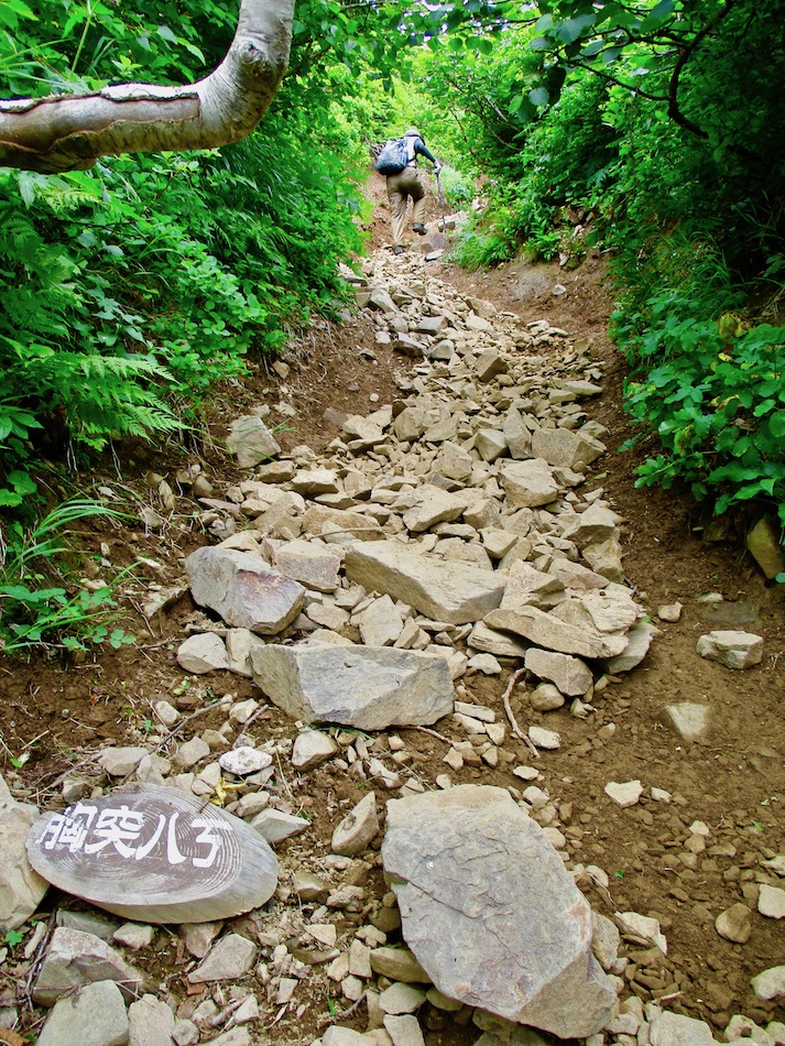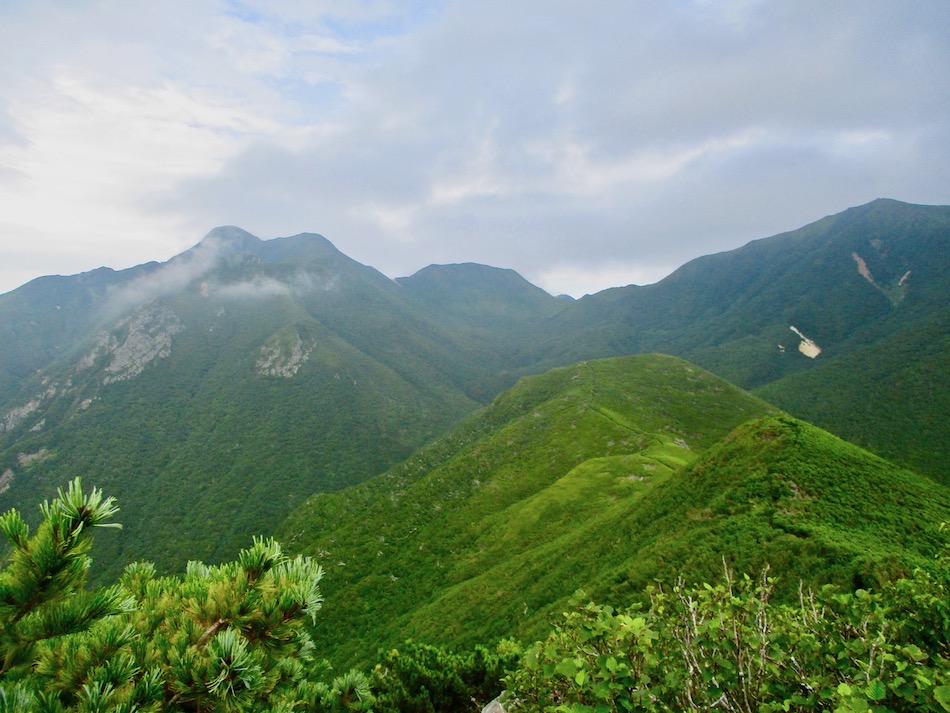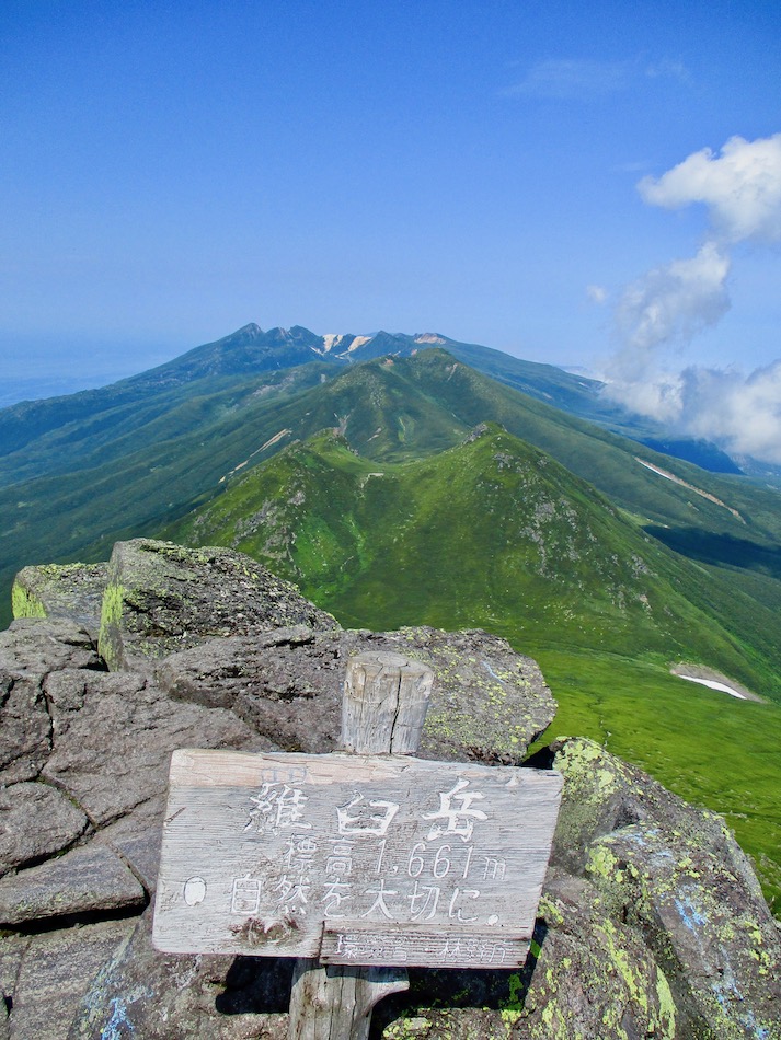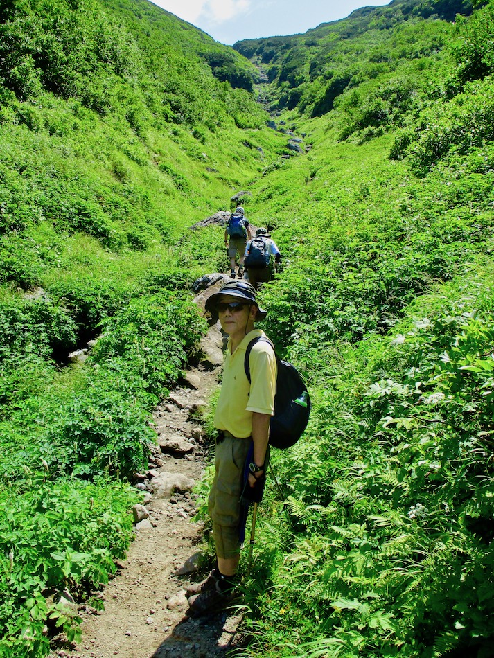 ら。昨夜は店内での宴会だったが、今日はテラスで食事。ト レー2つで一人分、美味しいけれど量が圧倒的過ぎ! 眼前にはオホーツクの海が広がる。 爽やかな空気もご馳走だ。 8時半前、標高 230mにある木下小屋の羅臼岳登山口から 入山、標高1661mの羅臼岳山頂を目指す。 広葉樹林の中の登山道に入ると、すぐに急斜面をつづら折 りの登山道が続く。眺望の利かない厳しい登りに汗が滴る。 昨日の斜里岳で疲れた足は重く、登頂への不安と熊との遭 遇への不安が重くのしかかる。なんたってウトロでは連日飼 い犬が熊の餌食になっているのだ・・。(冷汗) しかも、狭い登山道のあちこちに昆虫を絡める蜘蛛の巣の 如く木々が低く枝を張っている。昨日の斜里で20回、今日 は30回以上頭をぶつけ、顔面をぶつけた。ショックで頭の 切れが良くなるものなら我慢もするが・・。 こんな状況で写真を撮ることに頭が回らなかった。弥三吉 水・銀冷水の2つの水場でも冷たい甘露水を頂いただけ。 カメラを手にしたのは、羅臼平に続く大沢に出てからだ。 羅臼平が近づくにつれ、いろいろな野草が目を楽しませて くれる。特に、鮮やかな青のリンドウに目を奪われた。 大沢を登り切ると標高1345mの羅臼平、ここで登山道は左 右に分かれる。 左に折れると三ツ峰を経て硫黄山へ至る。 右へ進んだ先に聳えるのが羅臼岳だ! 不安一杯、途中離 脱も選択肢だったが、ここまで来たら!! 軽く空腹を満たし、温かいコーヒーを飲んで遠い山頂に向 かう。『レッツゴー!』 しか〜し、最初の松の絨毯を縫って歩くのは大して負担で なかったが、その先に最大の試練が待ち受けていた。再びカ メラは山頂まで出番なしになった・・。 まるで、岩山登山だった。しかも、岩はでかく、傾斜は急 峻。時に四つん這いになり、時に岩に縋り付いて登った。写 真より身の安全確保が最優先。 もっとも、無事帰宅した今は写真の少なさを残念に思う自 分がいる。ったく〜〜、贅沢にもほどがあるぜ・・。 しかし、標高差1400mを登り切り、半ば無理かと思ってい た難敵羅臼岳制覇! その山頂から三ツ峰、硫黄山方向を望む景色。 国後島・太平洋側は雲の下・・。 オホーツク海側は ウトロ『桂田』方向を見下ろす眺望。 不思議なことに、身の危険さえ覚えながら登った岩場だっ たが、降る時にはゆとりがあった。視野が広がるからだろう か、進むべきルートが自ずから見えてくる感じだ。 従って、再びカメラ登場。高山の宝石をご覧あれ。 木の枝との数多のぶつかり稽古の痛み、降りの衝撃に黒ず み死んでしまった足の爪、強烈な西陽、全てに耐えながら山 を降りた。 その間、我が頭を独占したのは露天風呂! 風呂嫌いの我 が想いは、ビールでなく風呂に溺れたのだ。 写真の少なさに反比例して、思い出多き羅臼登山だった。 本日のルート・距離 羅臼岳登山:15km