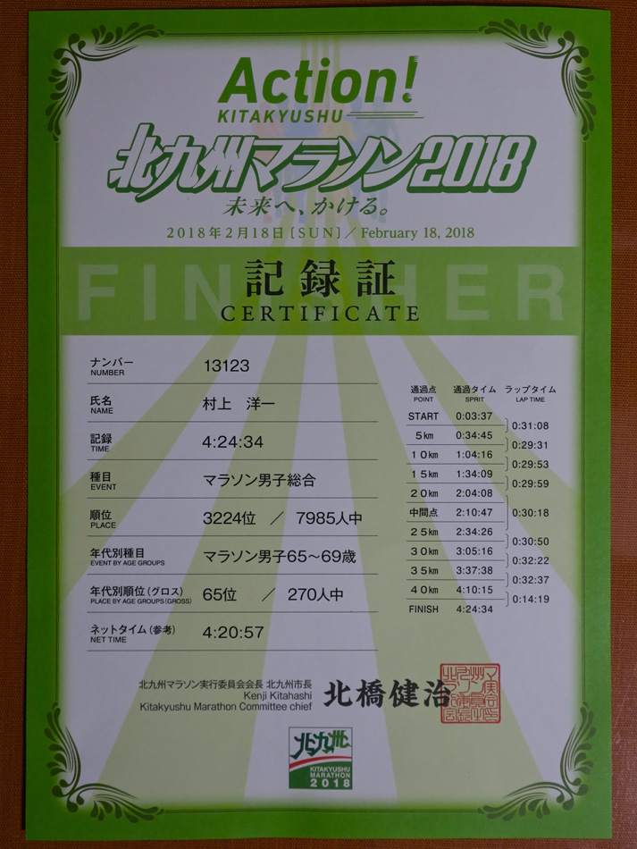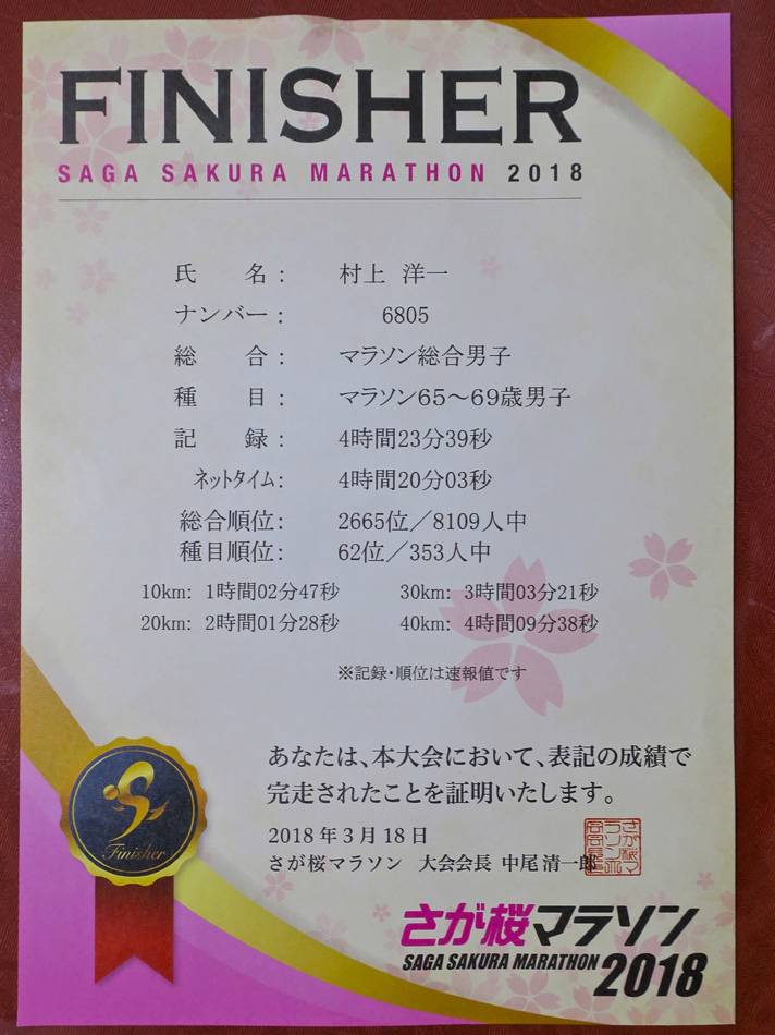 念にストレッチをし体をほぐして朝食。 チャーターバスの出発時間午前6時10分。遅れては大変と天神 の集合場所まで自転車を走らせた。まだ天神は眠っている。 さが桜マラソン日帰り参加にはチャーターバス利用 が超お薦め。 二人掛け座席を一人で利用も可能なゆったり乗車。1時間で会場に 到着、しかも会場の更衣・荷物置き場のすぐ近くで下車だ! スタート約2時間前到着で、余裕を持って更衣・トイレを済ませ られた。唯一気がかりは朝から広がる青空と光り輝く太陽・・。 増田明美さんの激励トークも終わりいよいよスタート時間。 号砲一発! ランナー約一万が走り始める。いや『歩き』始める。 スタートライン通過まで3分半、まともに走れるのは10分後? スタート後しばらくすると曇り空になり、熱中症の不安なく走り に専念できたのはありがたかった。 さて、先ずはGARMINでみる今回のデータ: 0〜5㎞:5:56/km(612→554→550→550→552) 5〜10㎞:5:49/km(545→556→549→549→548) 10〜15㎞:5:47/km(554→542→549→539→551) 15〜20㎞:5:53/km(547→553→555→550→600) 20〜25㎞:6:04/km(556→559→601→609→615) 25〜30㎞:6:15/km(608→613→620→613→619) 30〜35㎞:6:30/km(620→636→623→634→638) 35〜40㎞:6:39/km(641→645→627→637→643) 40〜Goal:6:20/km(635→607→614) 完走証の記録: Gross:4時間23分39秒 Net :4時間20分03秒 北九州マラソンに続き今回も歩くことなく二連続で『完走』! 4時間切りはならなかったが、4時間を目標にする資格は獲得? 反省点と評価点 反省点: ・スタート前GPS設定を変更、変更ミスで役に立たなかった → レース直前・レース中の変更は原則禁止 ・ペース走等々、レースペースを意識した練習が絶対的に不足 → レースペース即ち目標ペースを体に覚え込ませる ・体のリラックスをもっと意識し心掛けて走るべきだった 評価点: ・『完走』の気持ちが揺るがず、心配・不安を感じなかった → 先を心配することなく、今に集中できた ・給水・補給が上手くできた。OS1ジェルタイプかなり有効 ・サブ4挑戦の気持ち・意欲を取り戻した → 『まだやれる』という思いを強くした チャーターバス, 1000円追加で弁当を申し込んだが、これまたお 薦め。空腹の余り撮影前に箸を付けてしまったが、充実の全12品 で美味! 蛇足だが弁当箱は捨てるのがもったいないほどお洒落! 往復の車中ある男性と話が弾んだ。別れ際になって分かったこと だが、家は我がジョギングコース沿いらしい! しかも、今は関東 勤務だが4月から福岡勤務になると!! 大濠のラン友誕生かな! ところで、先日の北九州マラソン記録証が届いた。今の実力・今 の練習では、今回の記録は妥当なところだろう。しか〜し、、、
