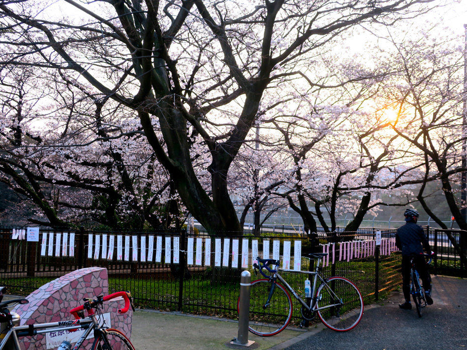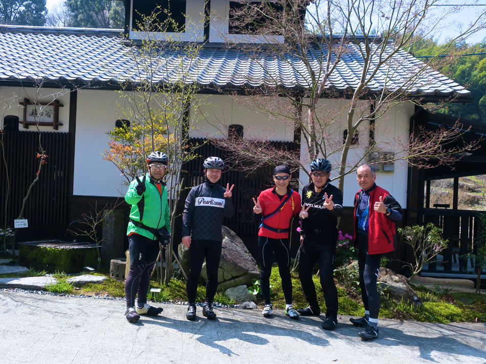 朝7時集合・出発、青空広がる絶好の日和。 出発間もなく桧原桜公園。桧原桜を透かして朝日が眩しい。 今日の天気で帰りには満開って感じだった。 天気には恵まれたが、足調には恵まれなかった・・。つ〜か 最悪の足調! まだマラソンの疲れが抜けきってないかな? 他のメンバーに全く付いて行けない。鼻歌まじりのマイペー ス。鈍亀ペースで遅れながらも、道沿いの桜の開花具合を見て 清水山行きを加えることにした。 知る人ぞ知る桜の名所清水山。難点は自転車で訪ねるには結 構な勾配の坂を上らなければならないこと・・。 上り始めて間もなく、迎えてくれる五百羅漢に力を頂いた気 がした。でけりゃ、途中でギブアップしていたろう。 かなりの勾配の道を上った先で出迎えてくれるのは、 清水寺三重の塔。 しかし、一番の見所は展望広場。桜を額縁に収まった筑後平 野の眺めは美事! 今日はPM2.5のせいか霞んでいたが見応え 十分。 距離を稼ぎ、上り坂にも満腹すると、待っているのは空腹の 虫。空腹と疲れに耐えながら黙々と走る5人。 その期待を決して裏切らないのが遊の谷! このボリューム! これで二人前。 食い入る10の目の先にあるのは、最後の超旨『メンモモ』 腹を満たして満足の顔々。 今日も楽しいサイクリングありがとうございました〜! って訳で、本日参加五人衆の集合写真。 左から Piccolinoさん、Kuboちゃん、グレッグさん、urumanさん 桜と地鶏を堪能した一日! しか〜し、貧脚の実力を遺憾な く発揮、恐らくは全行程の2/3(以上)を遙か後方で一人走 った単独ツーリングだった。(苦笑) 今日のツアーは遊の谷ツアー 4人+1人・・。ランだけで なく自転車の走力アップ顔晴ろ〜〜っ! 本日の走行距離:143㎞